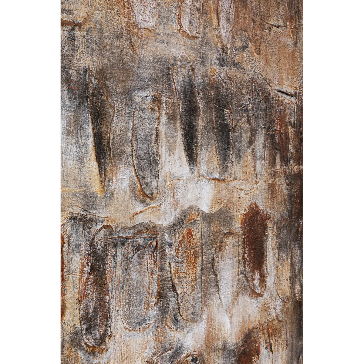 Key features of this large artistic piece include its organic shapes in warm brown tones, accents in gray and beige, and a high-quality canvas stretched on a solid spruce wood frame. Measuring 90 x 120 x 3.5 centimeters, it's the perfect size for adorning hallways, bedrooms, or living areas.