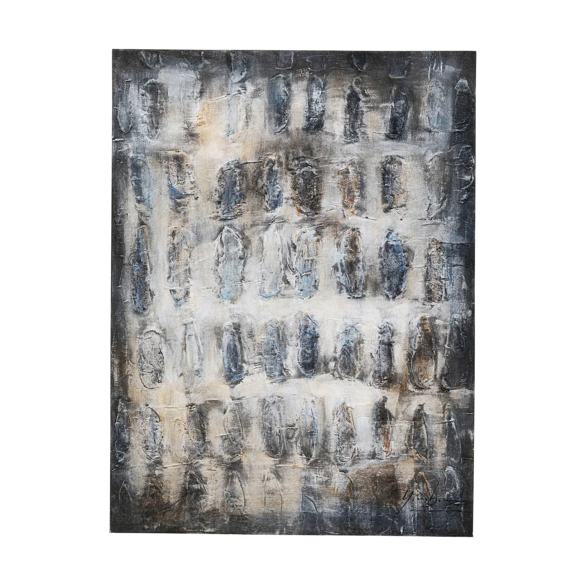 The key features of this large canvas picture include its artistic motif in cool grey tones, highlighted by accents of blue and beige. It measures 120 x 90 x 3.5 centimeters, and is artfully painted on high-quality cotton canvas, stretched on a sturdy spruce solid wood frame.