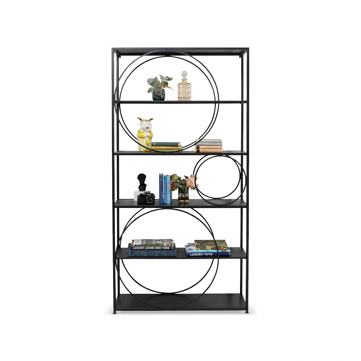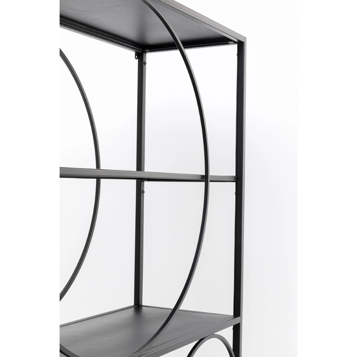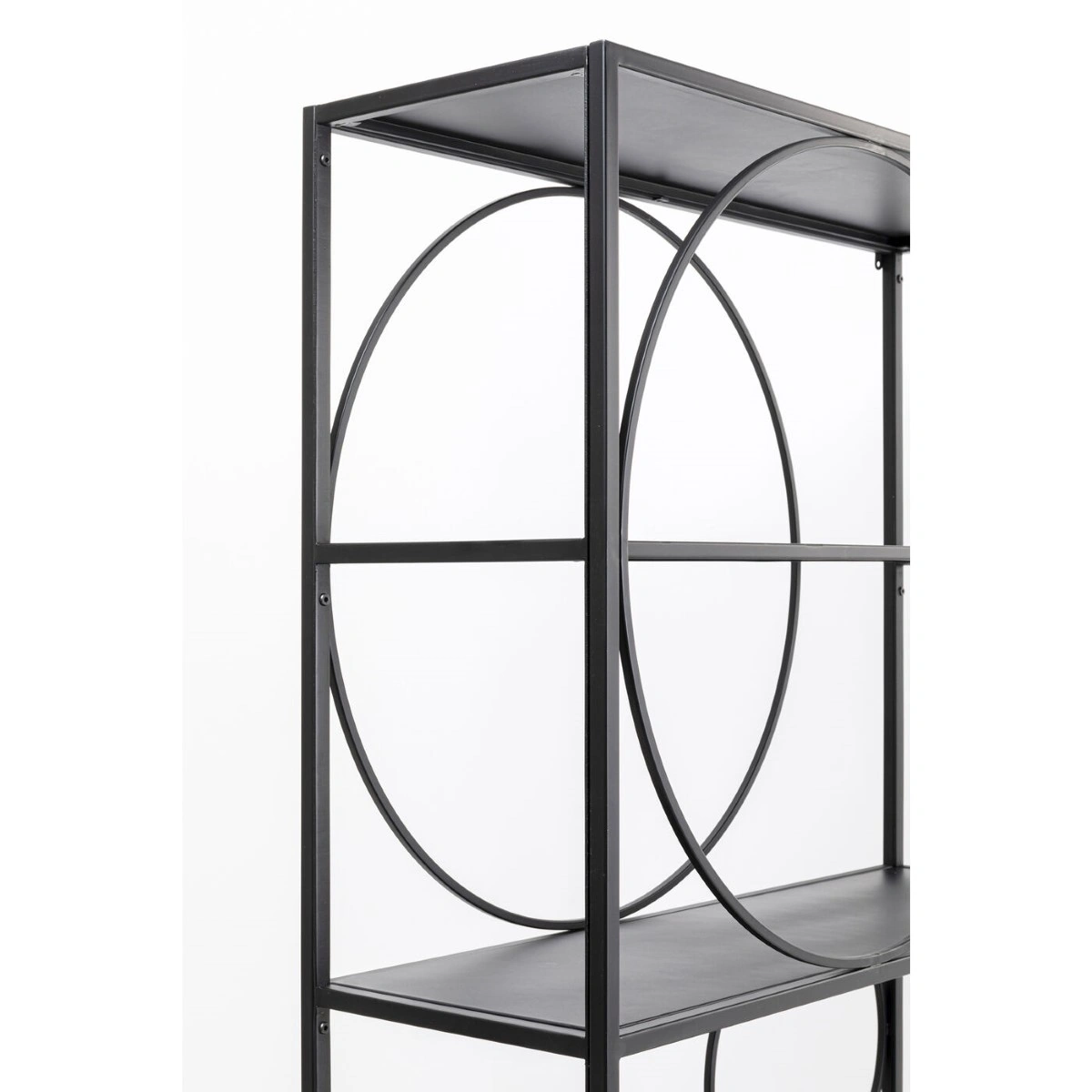 This imposing shelf unit with a height of 200 cm is definitely anything but ordinary! All in black in a modern and classic style, if it weren't for the circular steel rings that give the bookcase the proper breathtaking impact. A shelf unit with designer flair that will give your living room, study or even bedroom a character all of its own. Here you can let your imagination run wild with decorating ideas. In combination with plain, pastel-coloured wallpaper or a coloured wall you can bring out the best in this floor-standing shelving.