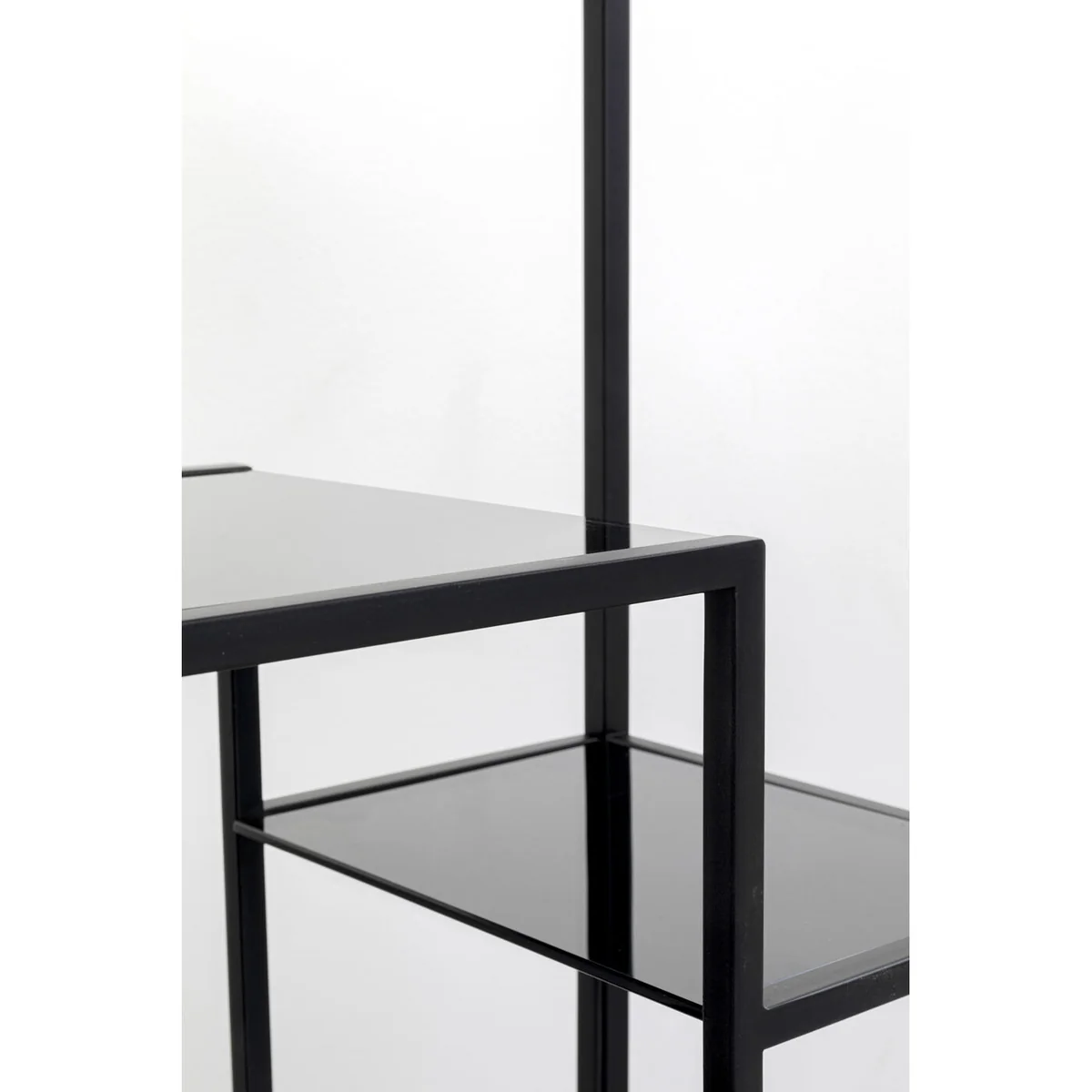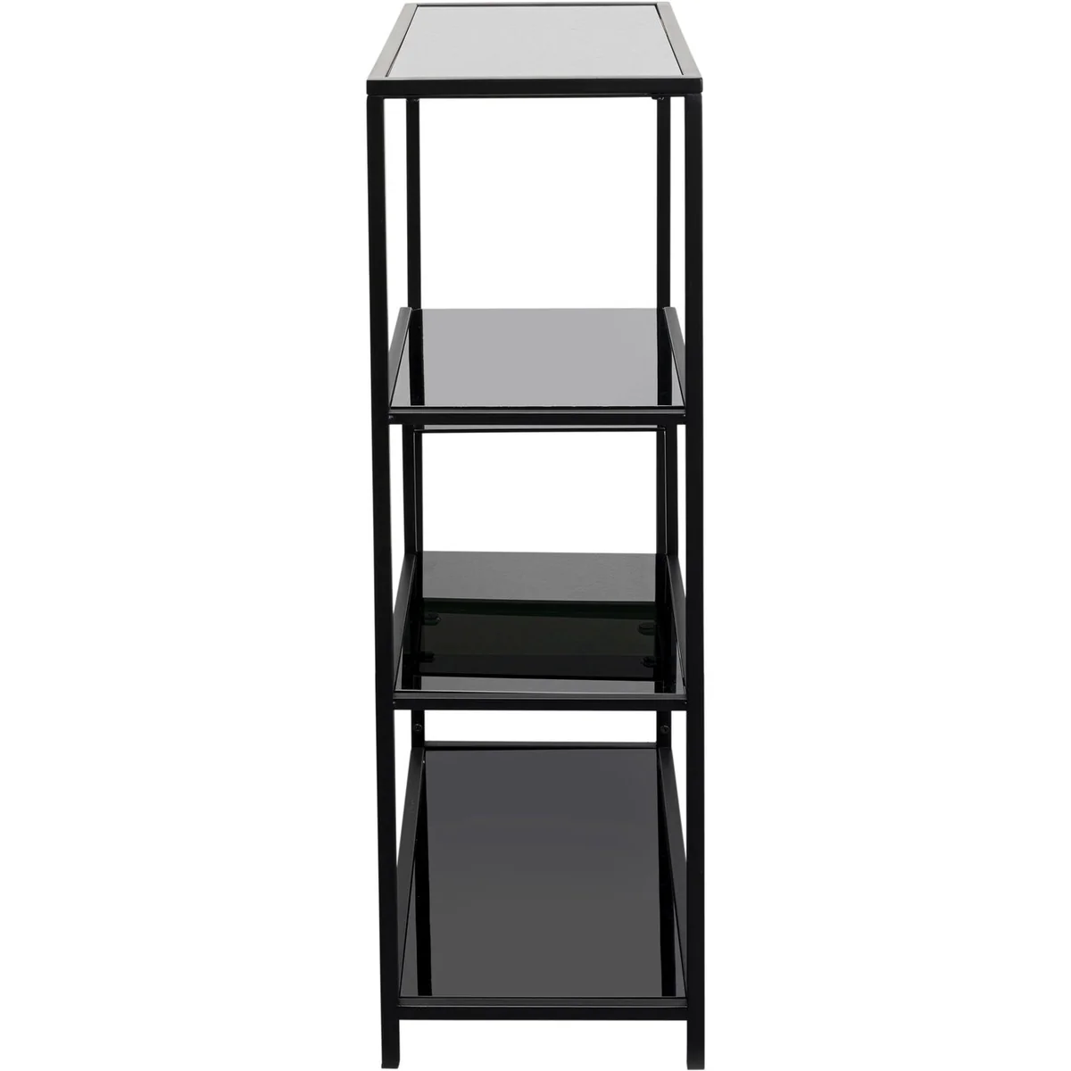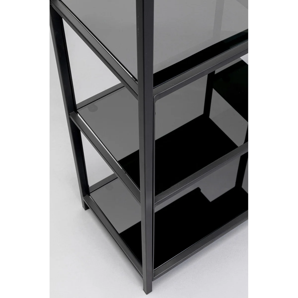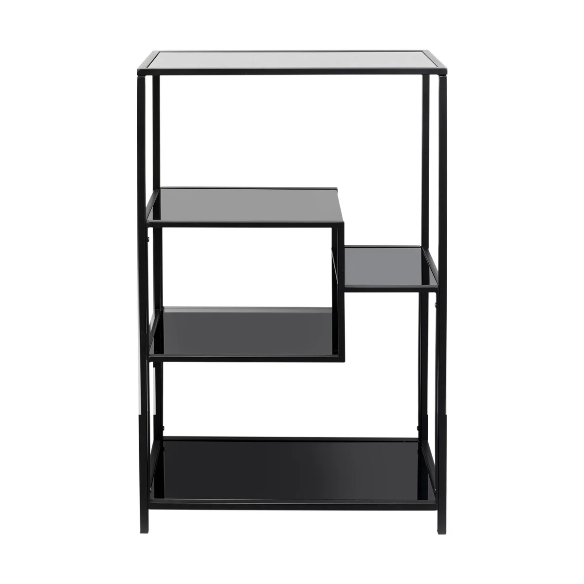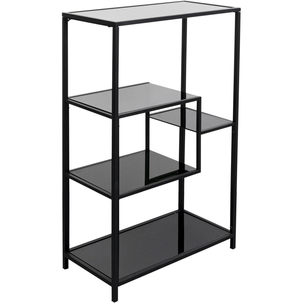 • Black steel shelf with glass shelves, 100 x 60 x 30 centimeters (H/W/D) • The interesting arrangement of the compartments and the simple color scheme create a striking, purist look • The shelf perfectly showcases books, plants, picture frames and decorative objects • Adapts to any living style with its minimalist look and can also stand freely in the room • A basic piece for eternity thanks to the high-quality material mix of robust steel and toughened safety glass