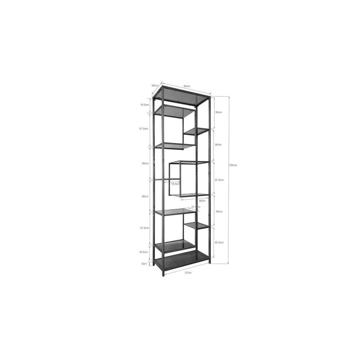 The key features of this Loft Shelf include its sturdy steel frame that's powder-coated for an elegant black finish. With dimensions of L 60 cm, D 30 cm, and H 195 cm, it provides ample storage space without dominating your room.