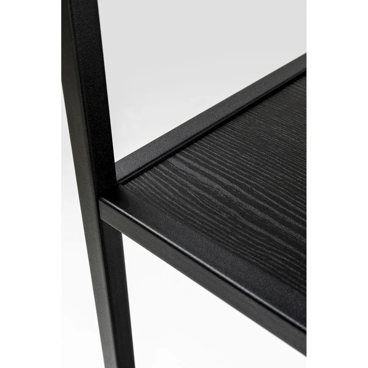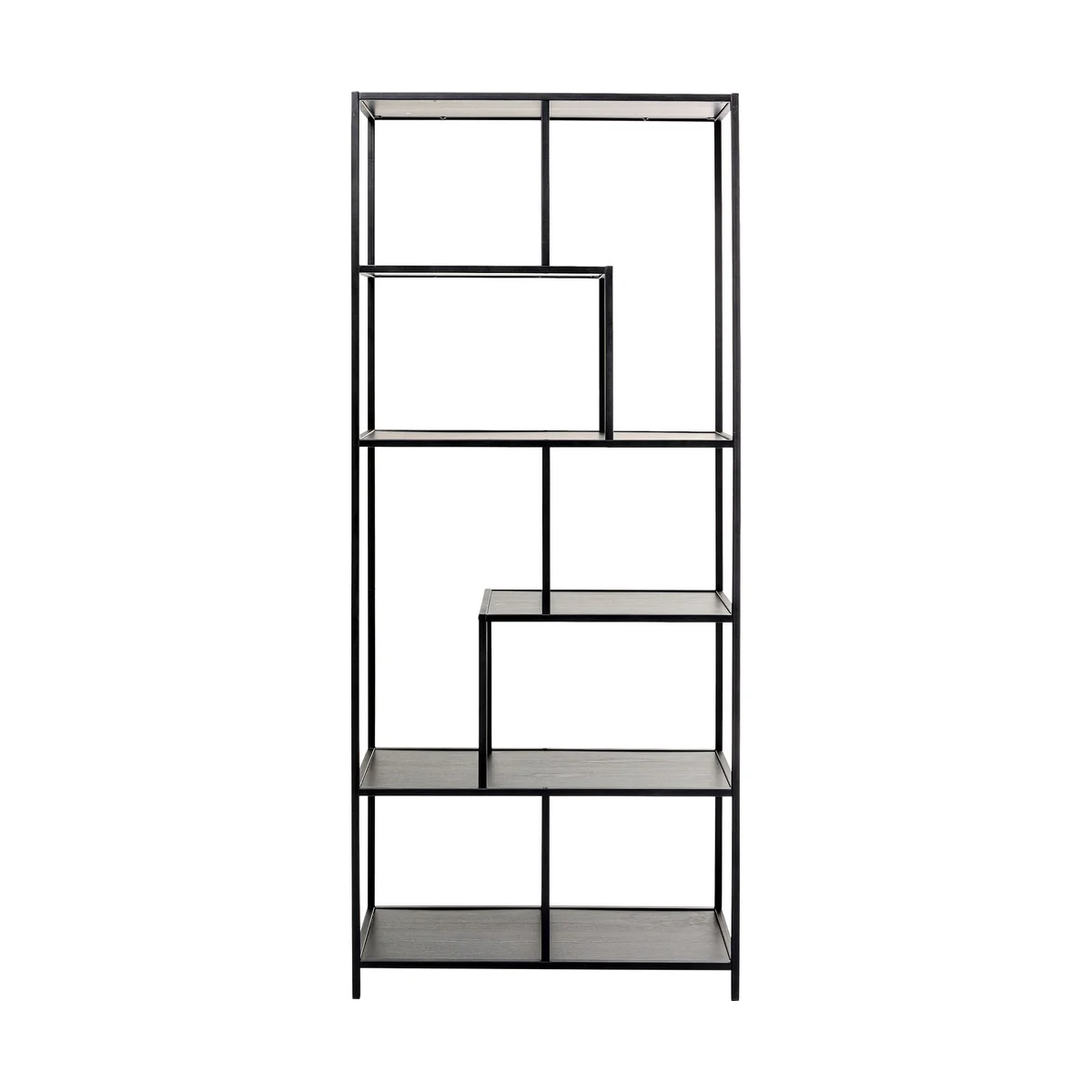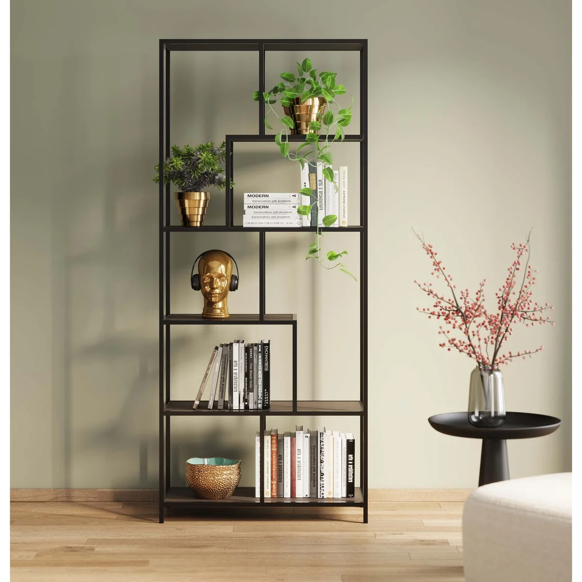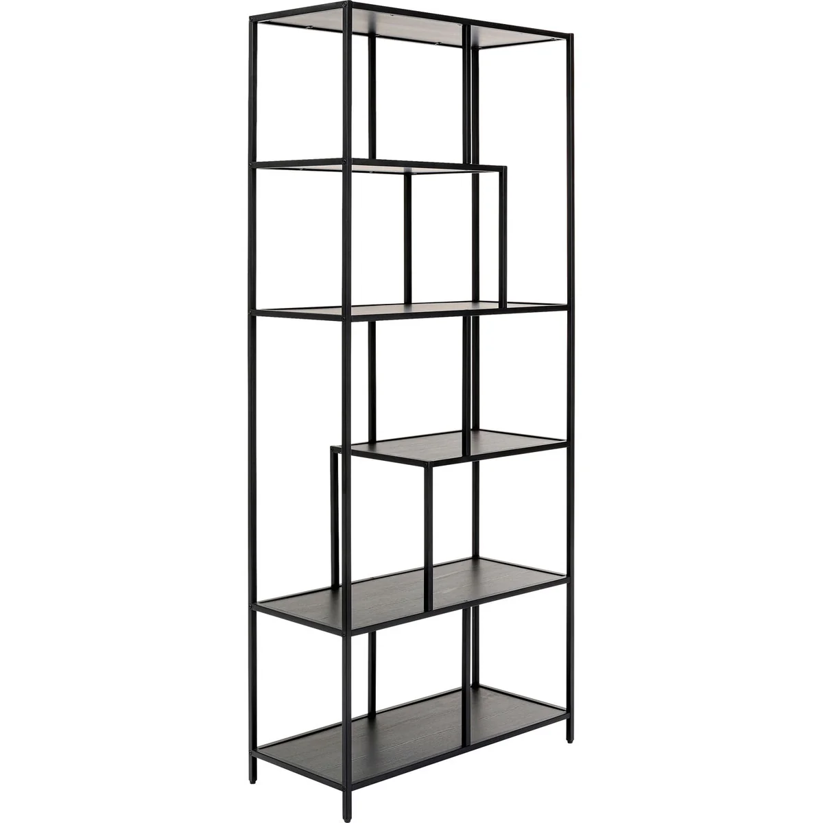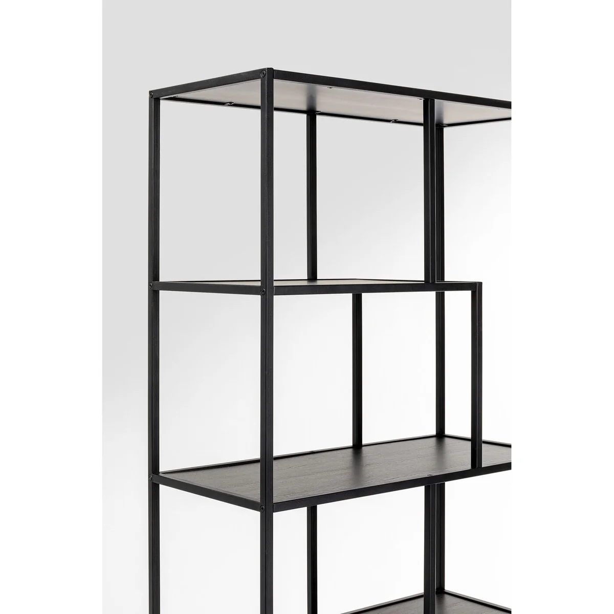 • Large, black metal shelving unit in loft style 185x77x35cm (H/W/D) • The black oak veneer wood shelves lend elegance to this floor-standing unit • More than just shelving for storage, as the offset shelves provide a great stage for decorative objects and more • Decorated with indoor plants, this steel unit becomes a vertical garden on the room wall • The shelves are fixed