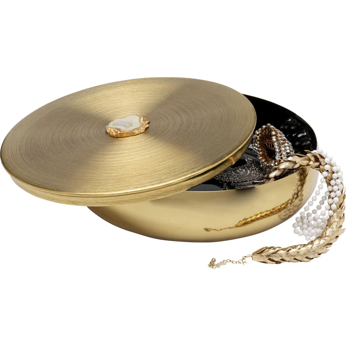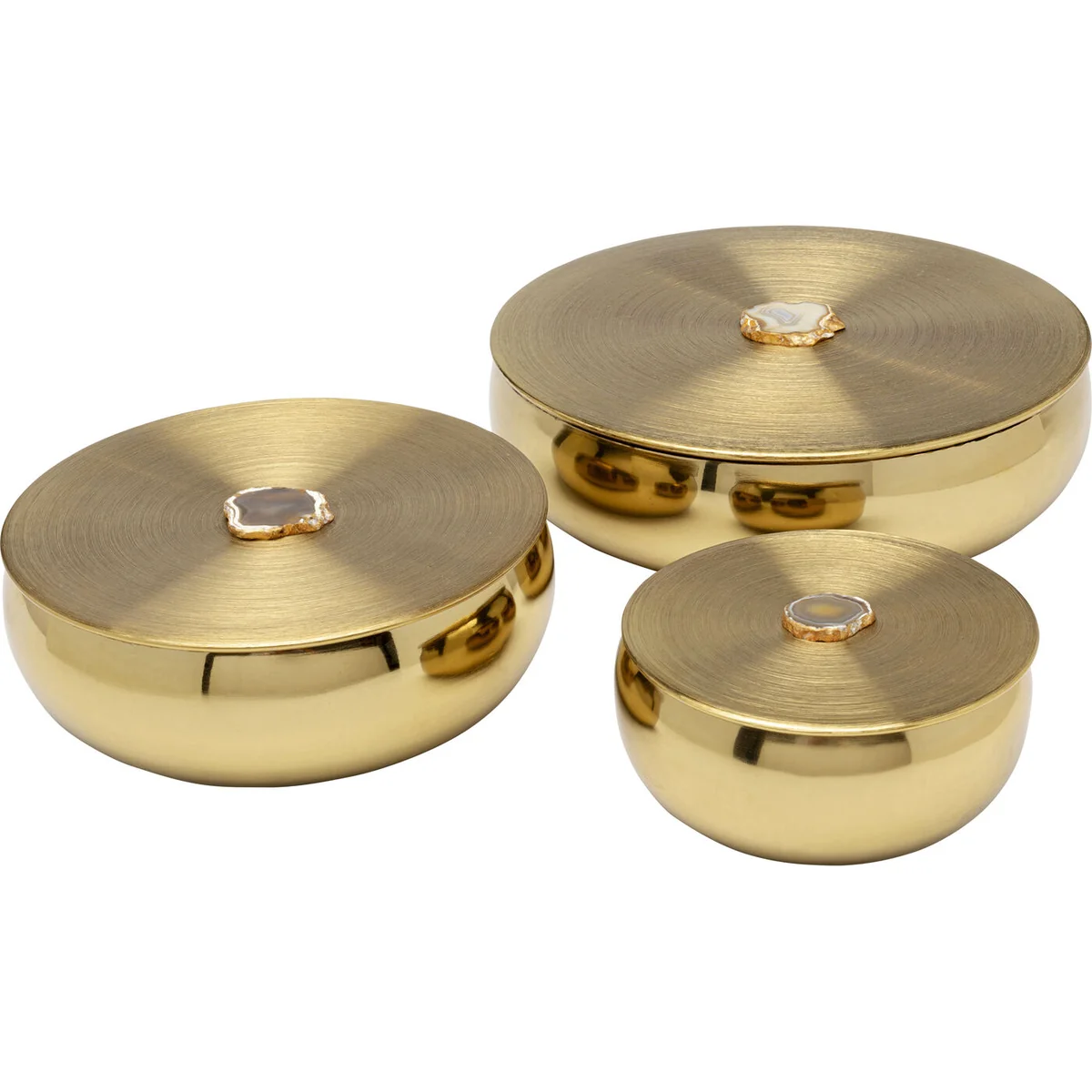 The box measures 31 x 31 x 8.5 cm, made from robust steel with a shiny gold finish. Its harmonious curves make it a stylish container for small treasures. The genuine agate stone handle, with its layered patterns and gentle color gradients, adds an element of sophistication and glamor.