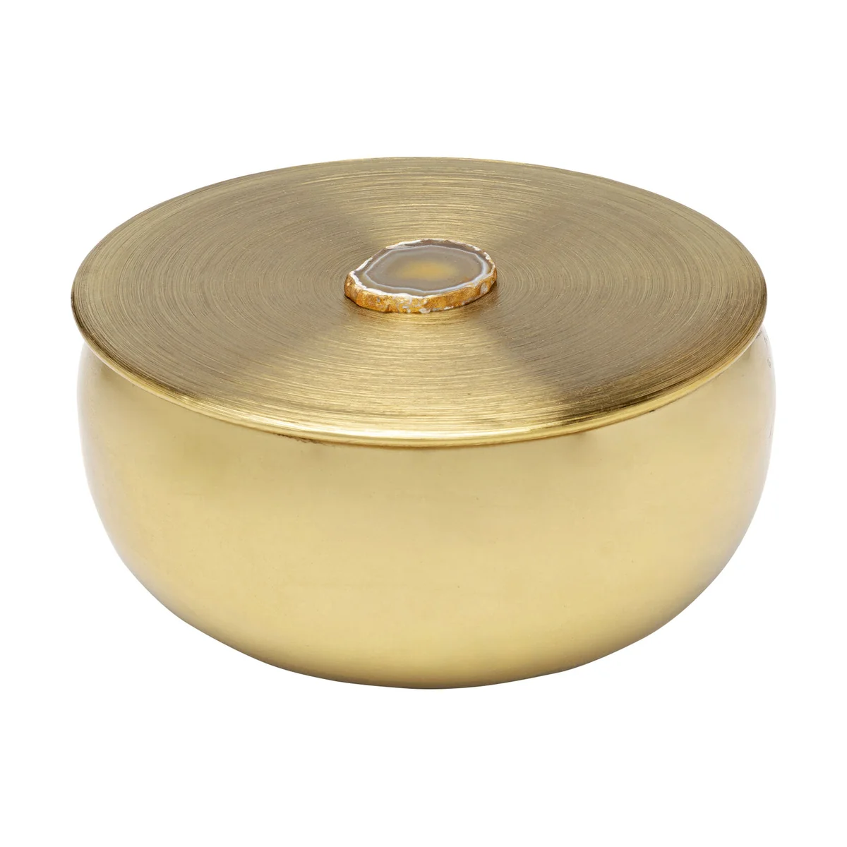 The Shine Deco Box features a rich blue glass body and an elongated shape. It is crafted from enameled steel and comes with a brass-plated top. An agate stone detail adds an extra layer of elegance. With dimensions of L 16 cm, W 16 cm, and H 8 cm, this box is a perfect fit for dining tables, sideboards, or open shelving.