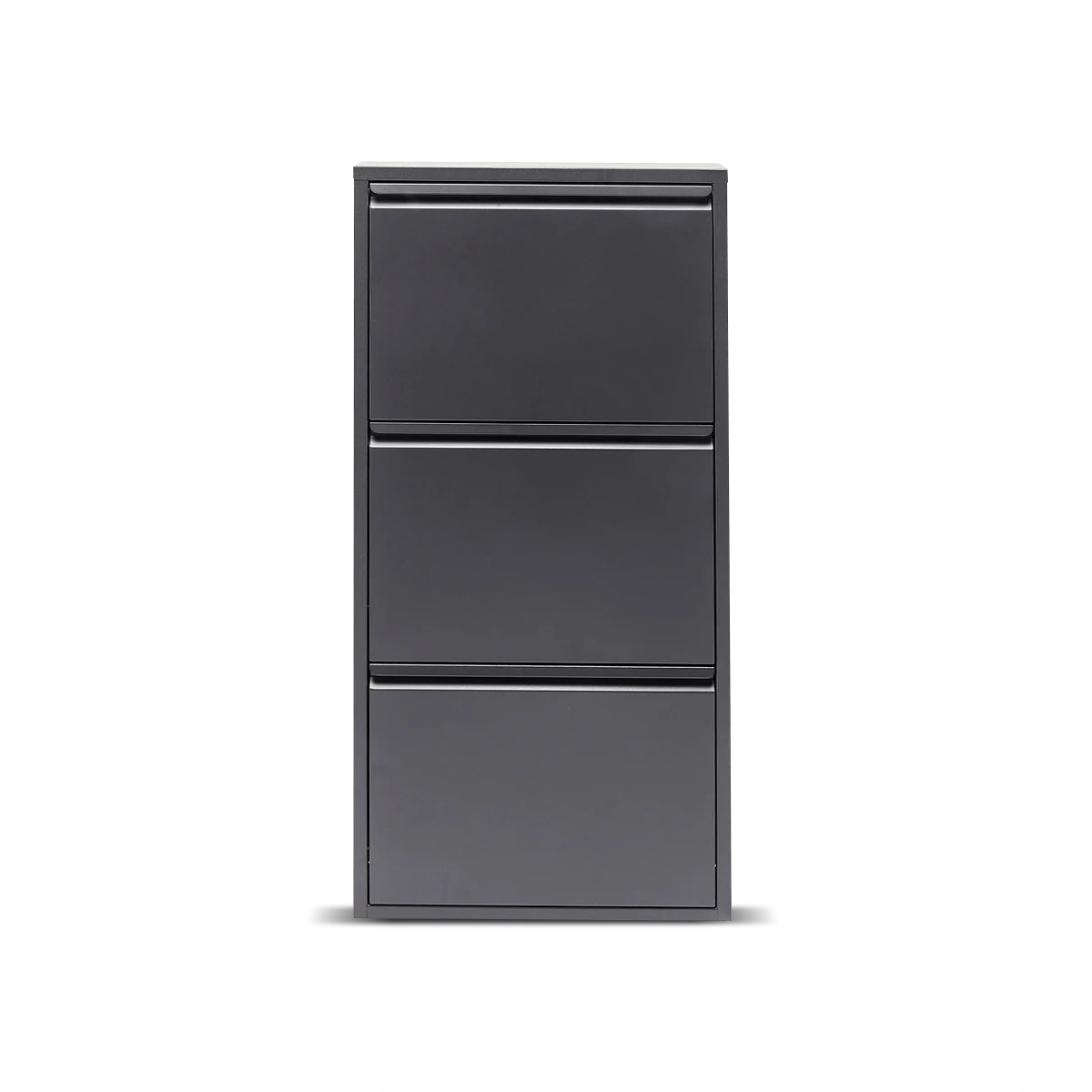 Shoes in front of the door? Or spread out on the stairs? Not a good idea. This shoe cabinet will put an end to the disorder. Three spacious tilting compartments offer plenty of protection and storage space. And thanks to the tilting drawers, order can easily be created. With its anthracite-coloured surface Caruso provides a modern touch in the hallway or dressing area.