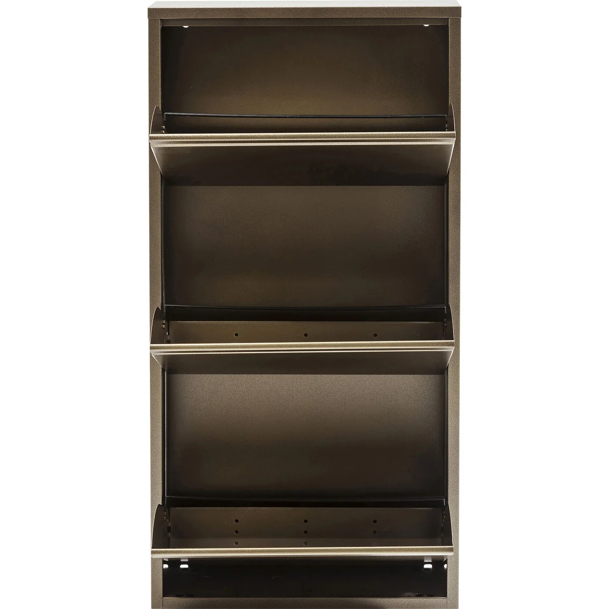 This sleek and modern shoe container is crafted with precision from powder-coated steel, featuring a compact design that saves space. It measures 50 cm in length, 14 cm in depth, and 103 cm in height, making it a versatile fit for any room. The bronze gold finish adds a touch of luxury and sophistication.