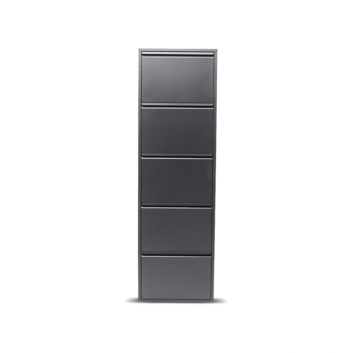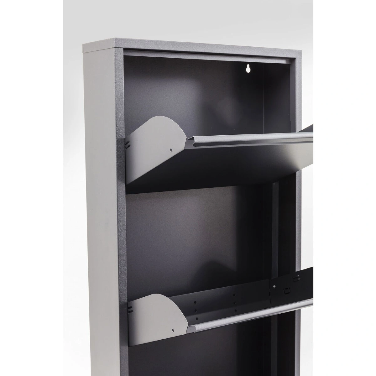 Shoes piled in front of the door? Or spread out on the stairs? Not a good idea. This shoe cabinet puts an end to the disorder. Five spacious tilting compartments offer plenty of storage space and protection against dust, creating order in a jiffy. With its powder-coated surface in dark grey, Caruso provides style in the hallway or dressing area.
