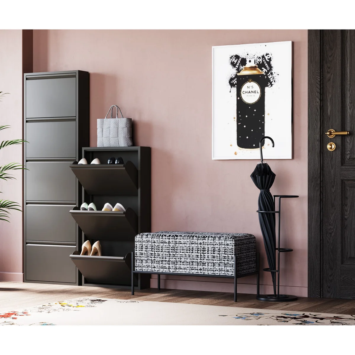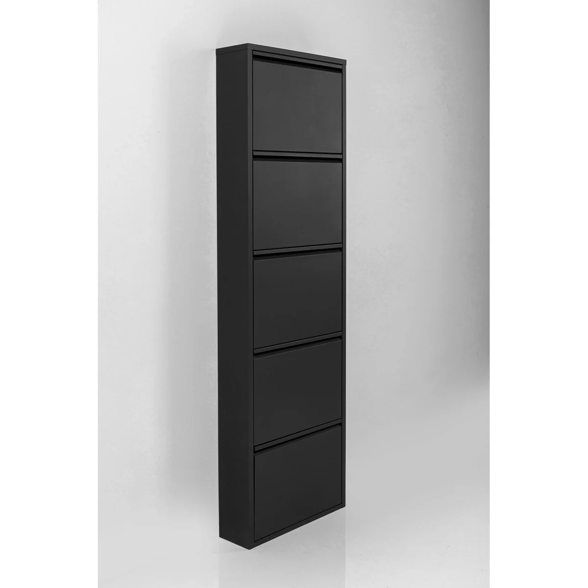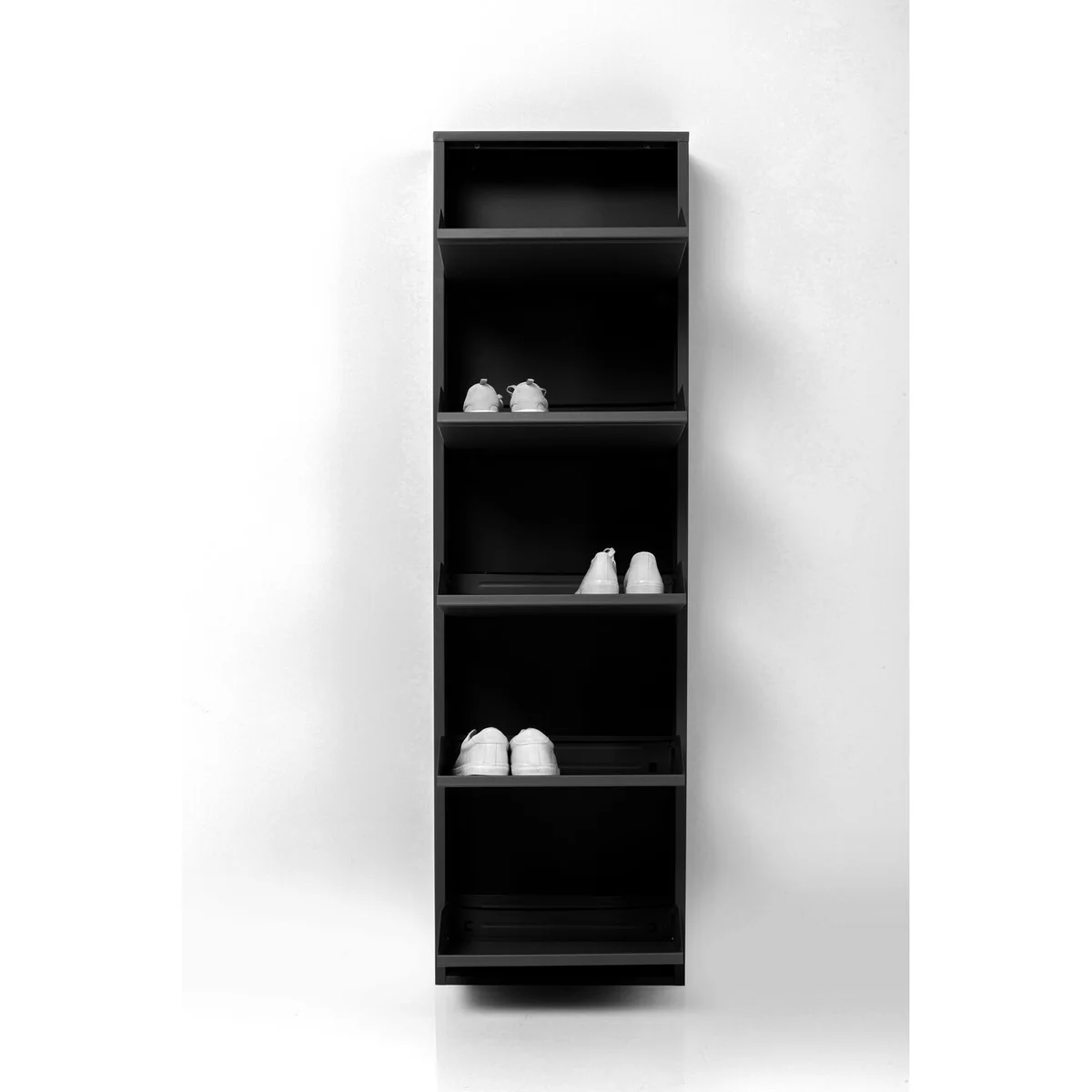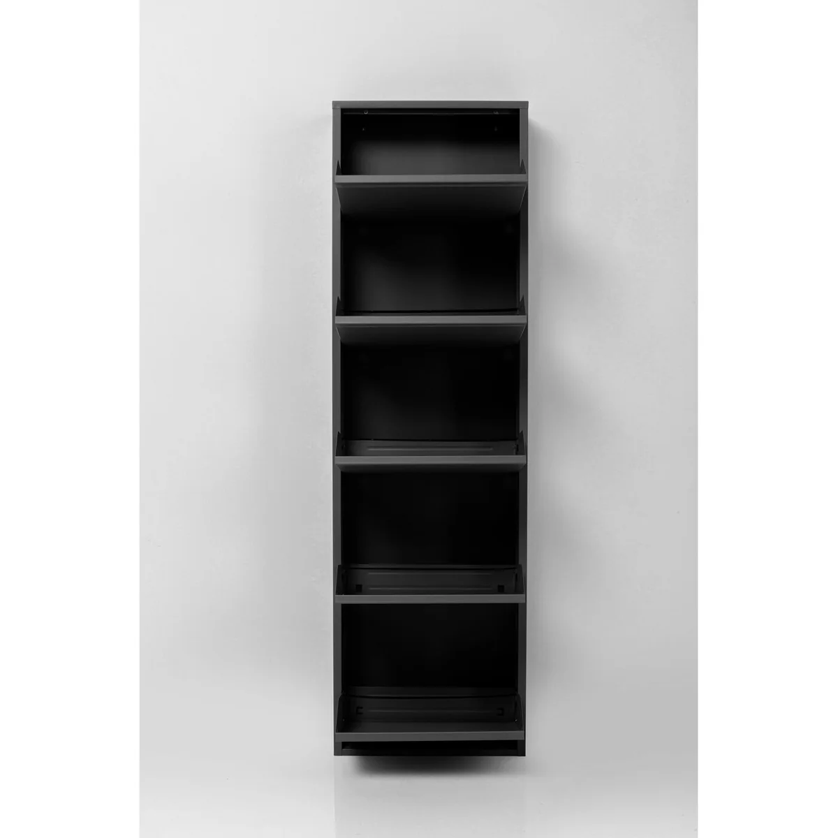 This shoe container features five compartments, accommodating multiple pairs of shoes. With dimensions of L 50 cm, W 15 cm, and H 173 cm, it is designed to fit in any corner of your room without taking up much space. The black powder-coated steel material ensures durability and adds a sleek touch to your decor.