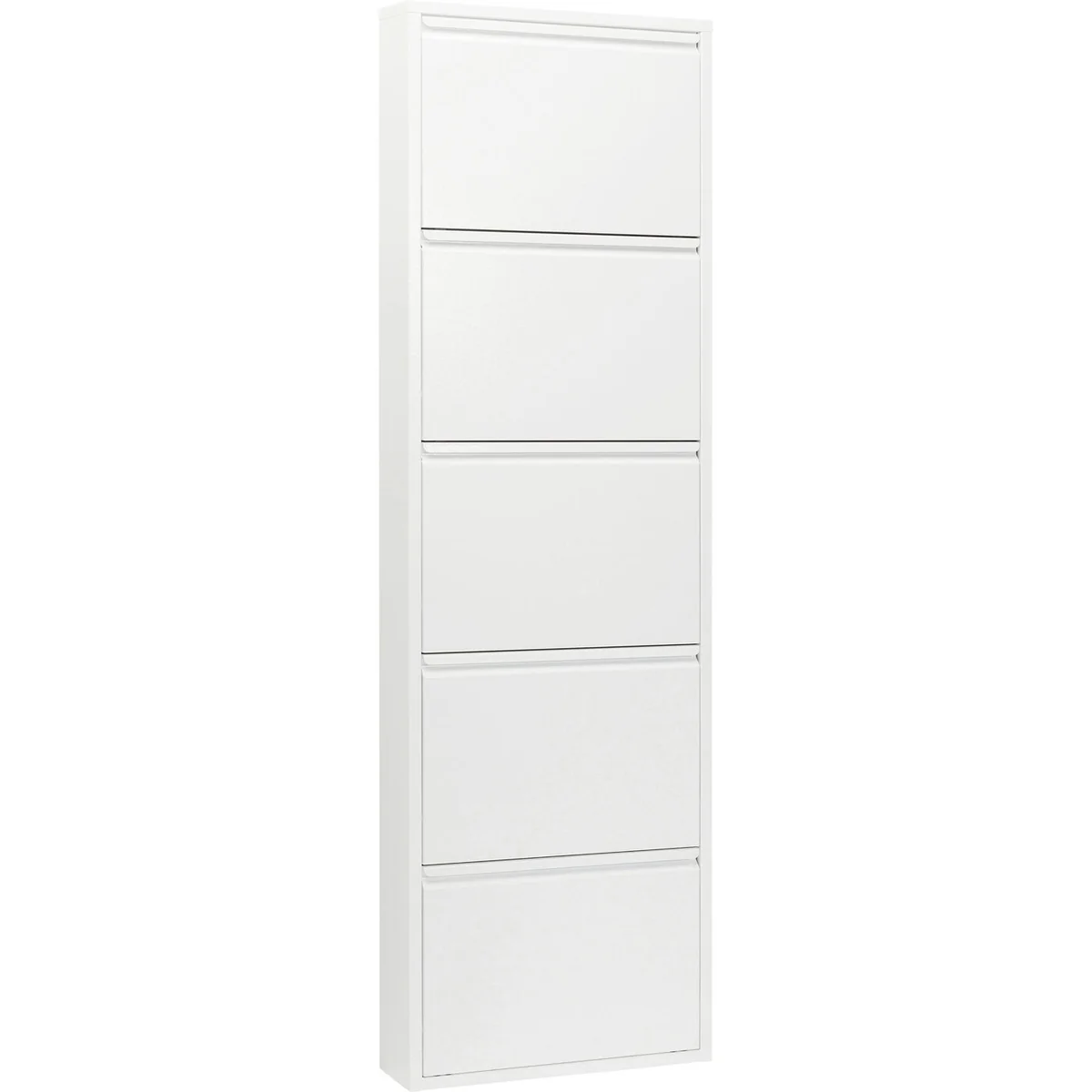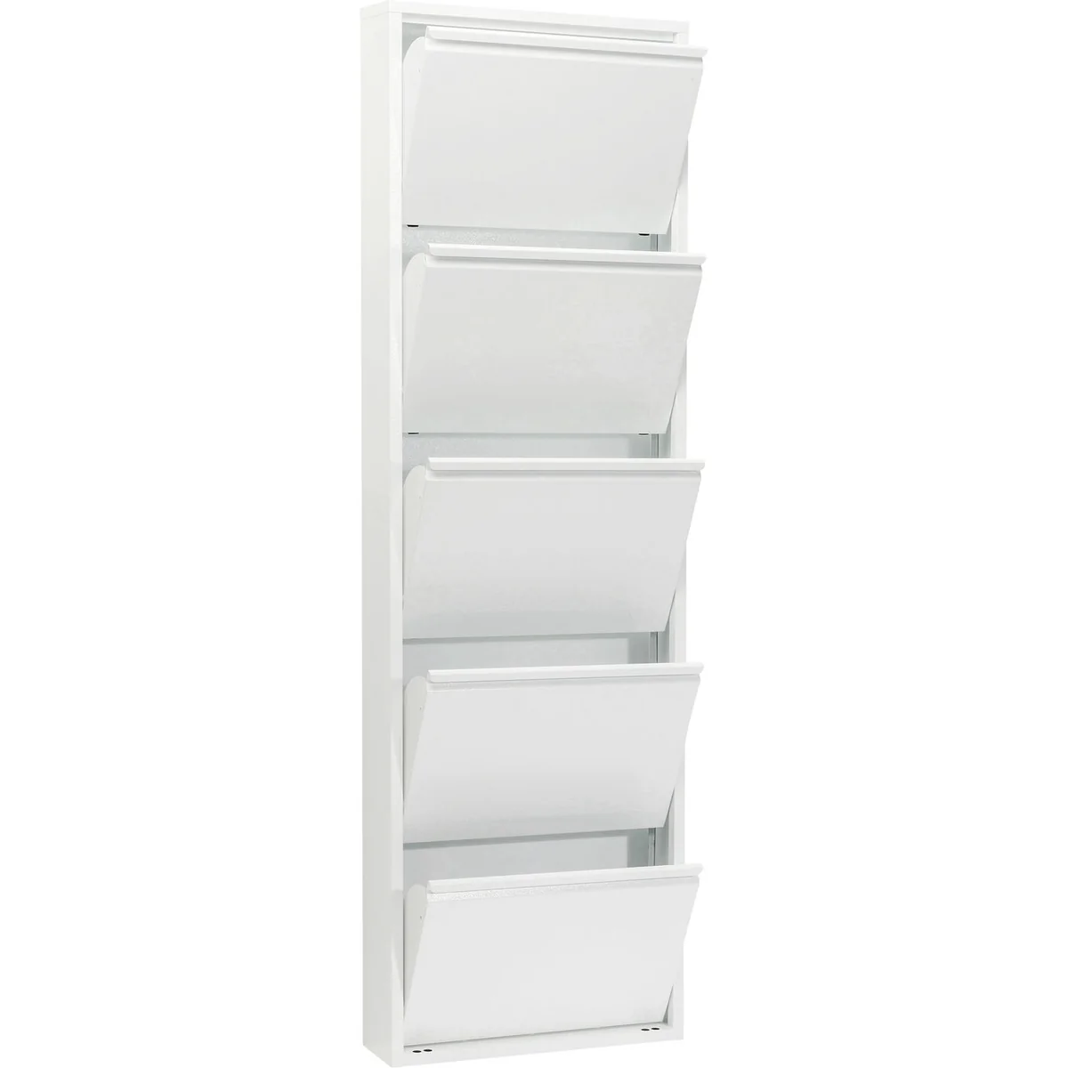 Standing at 170 cm tall and 50 cm wide, this 5-tier shoe container is crafted from durable sheet steel and painted in a modern white finish. Its compact depth of 14 cm makes it a space-efficient choice for your entryway or closet.