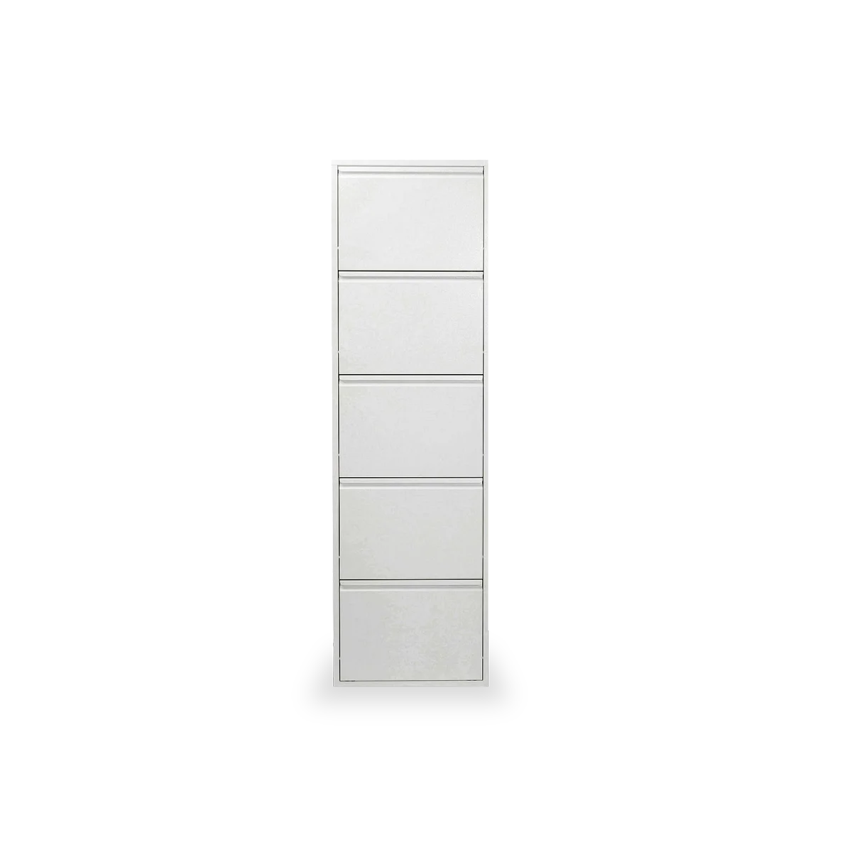 An elegant tilting shoe cupboard in a modern design - This shoe cupboard has been made of powder-coated sheet steel and provides lots of space for your shoes in its five compartments. The shoe cupboard is purist, smartly designed and confident – just like our Design & the City trend world. Smart young-timer furniture with striking geometrical lines, presenting a trend show without ornamentation for fans of clean-lined design. White and black are the basic colours of creative living with furniture in the 21st century. Design: Giorgio Cavallo.