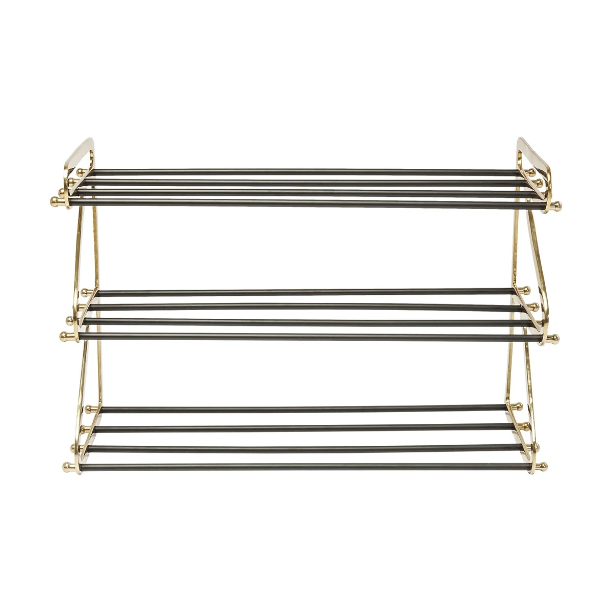 A versatile shoe shelf: as a side table, simple shelf or console table. The three-level shoe shelf impresses with its filigree gold frame, which is connected by round black lacquered rods.