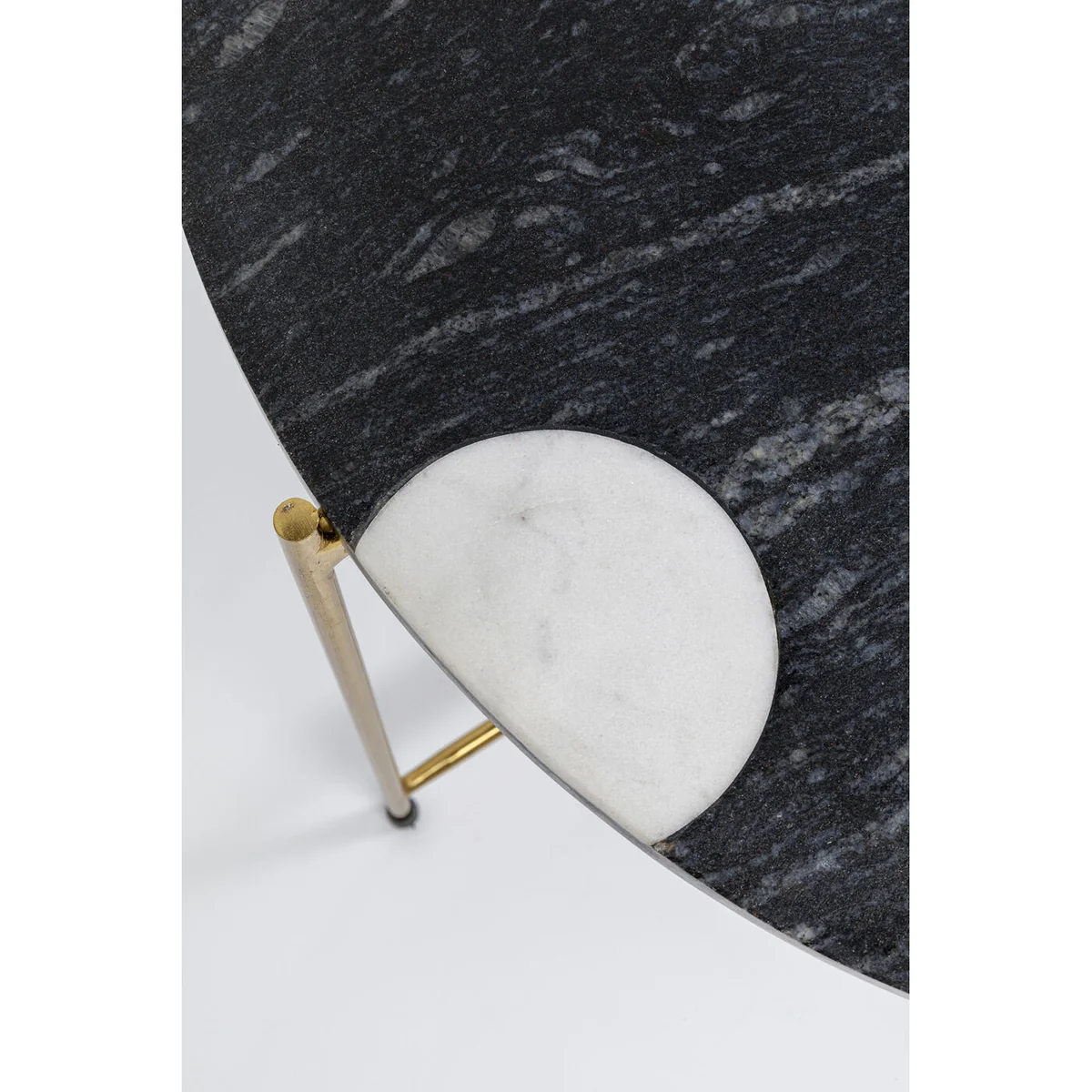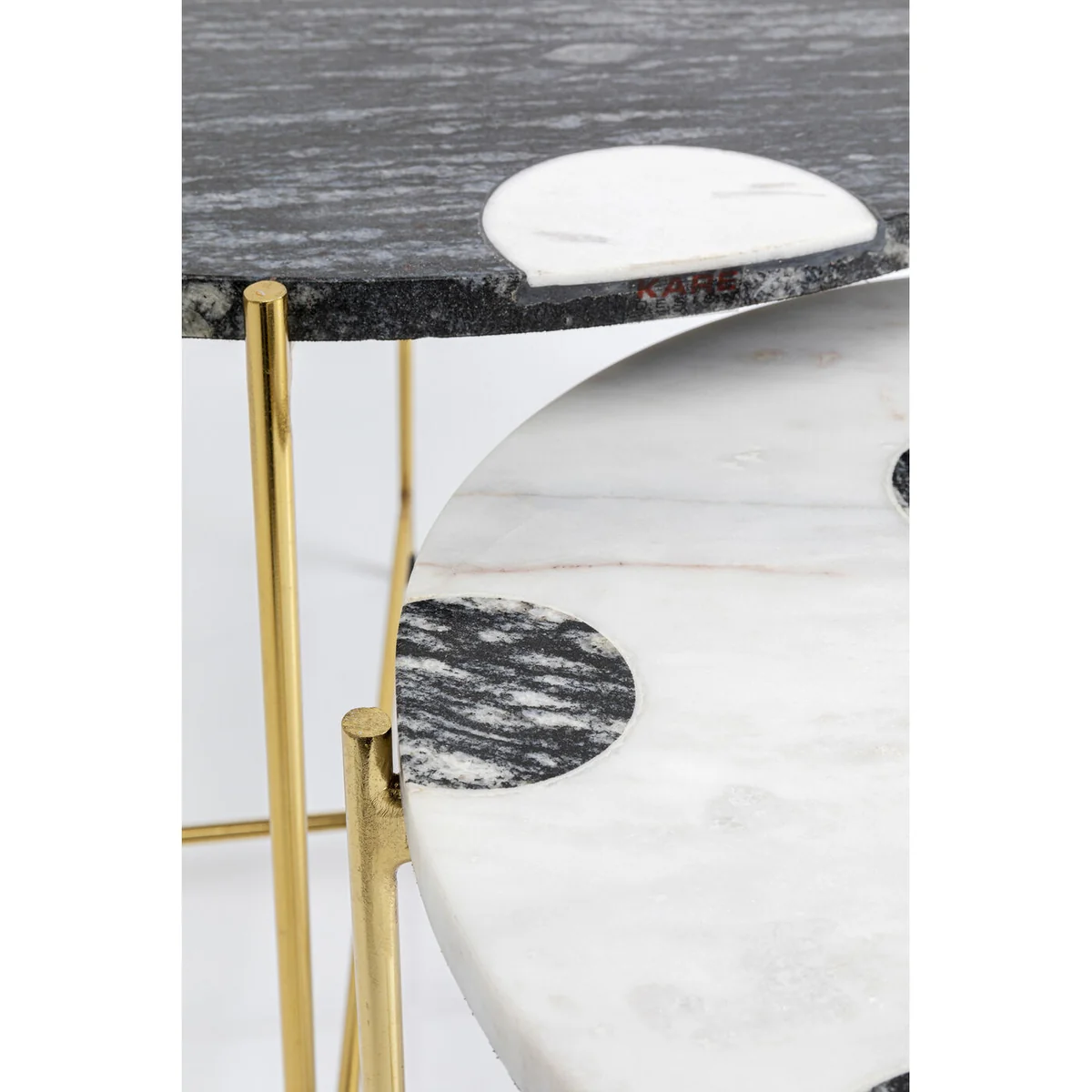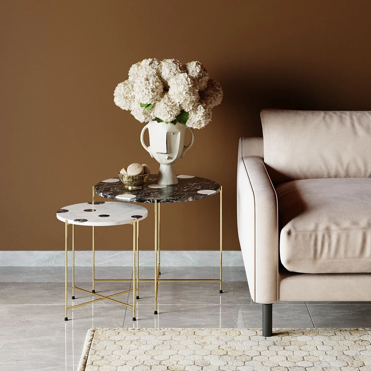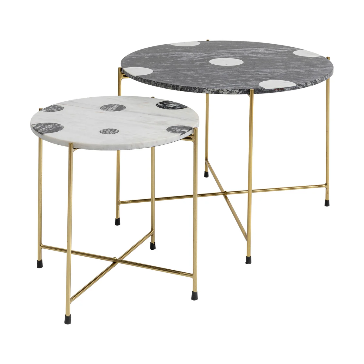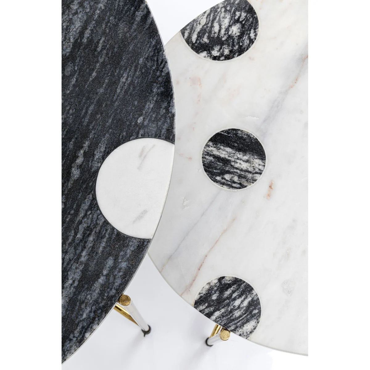 Handcrafted polka dots in black and white decorate the round table tops in marble look - sounds exciting, doesn't it? These modern side tables come in two sizes: one measuring 50x50x50cm, the other 40x40x45cm. They complement each other as a duo and perform just as beautifully as soloists. It’s usually the small things that make a home a real home. Side tables play a big role in this, because they can be used in many ways, make your four walls cosier and act as a showcase to beautifully present a pretty vase or a creative decoration. Side tables are ideal, for example, in the living room next to the armchair so that you always have everything at hand while you are reading, or as a bedside table for the bedroom.