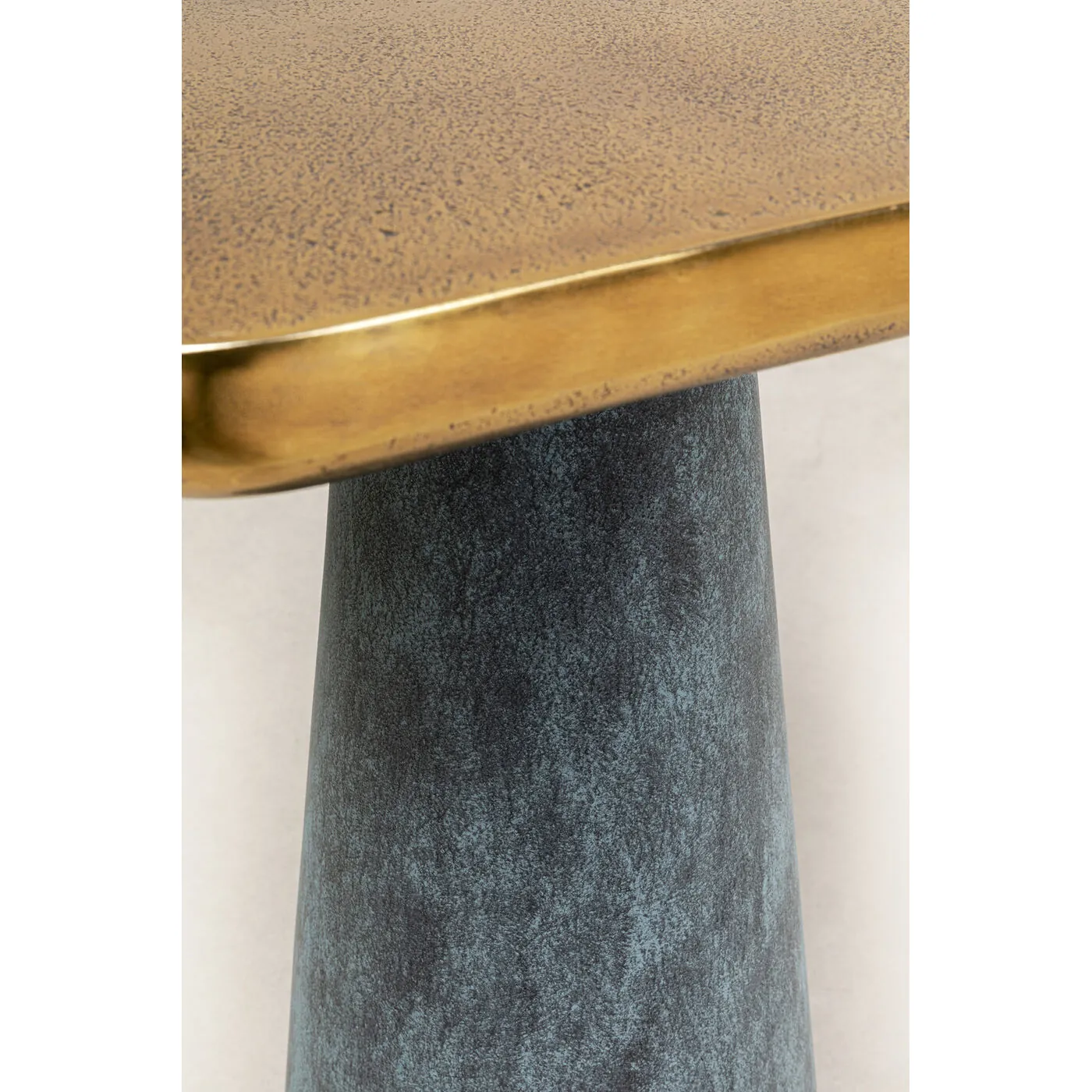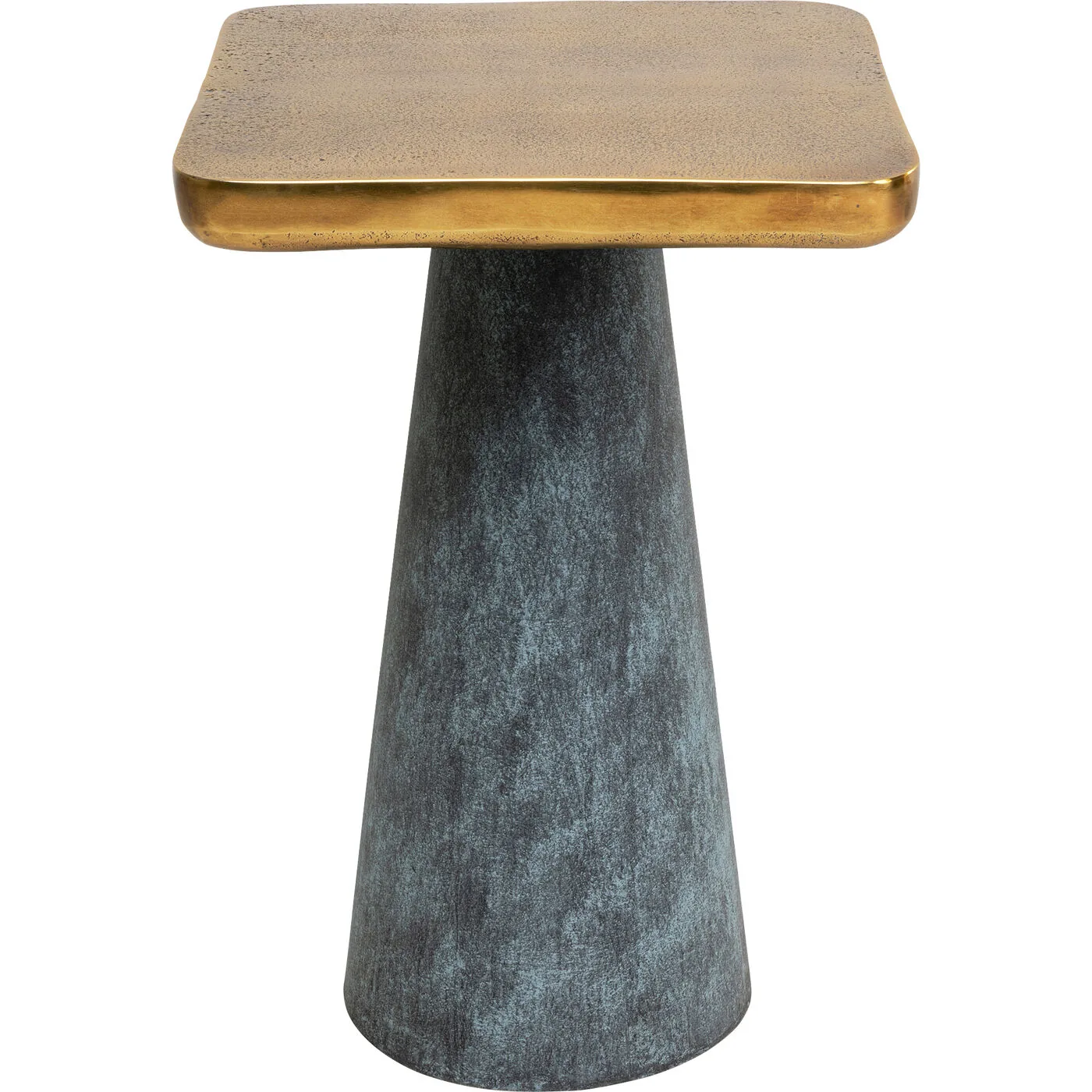 • Golden side table with a square top and round base