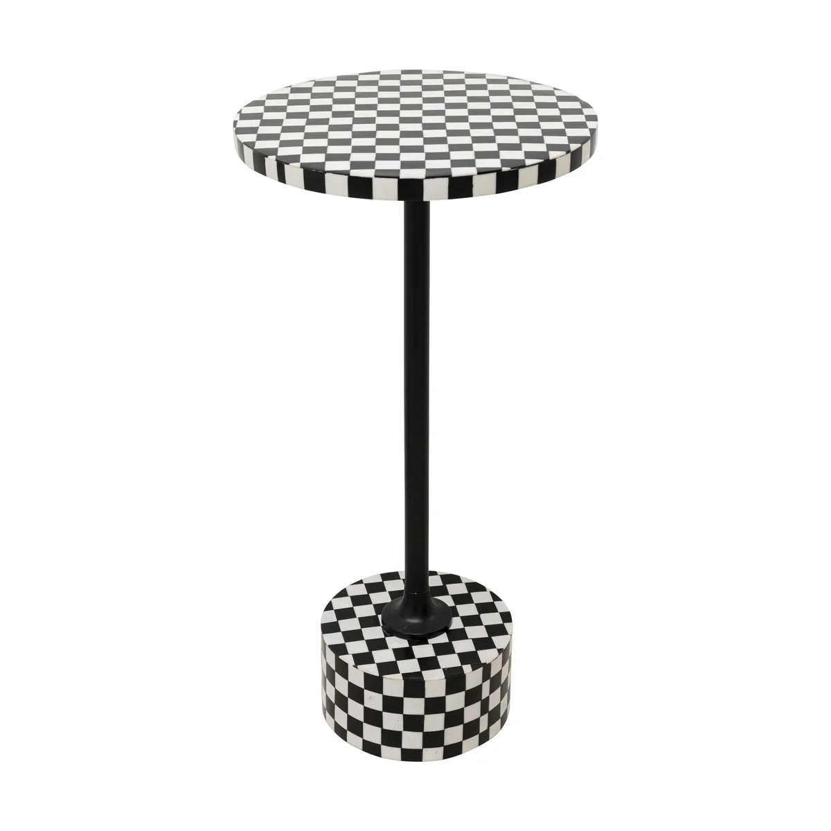 The table features a 25 cm square top with a height of 50 cm, perfect for displaying your favourite decor or useful for keeping your essentials within reach. The frame is constructed from durable, powder-coated steel, ensuring longevity and resistance to wear and tear. Its striking black and white chess pattern adds a touch of modernity to any space.