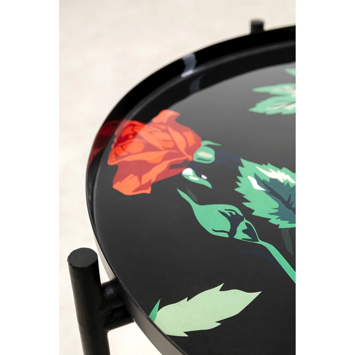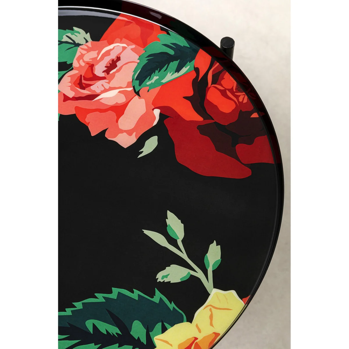 • Vibrant multicolor floral patterns on tabletop and legs that pop against the black frame