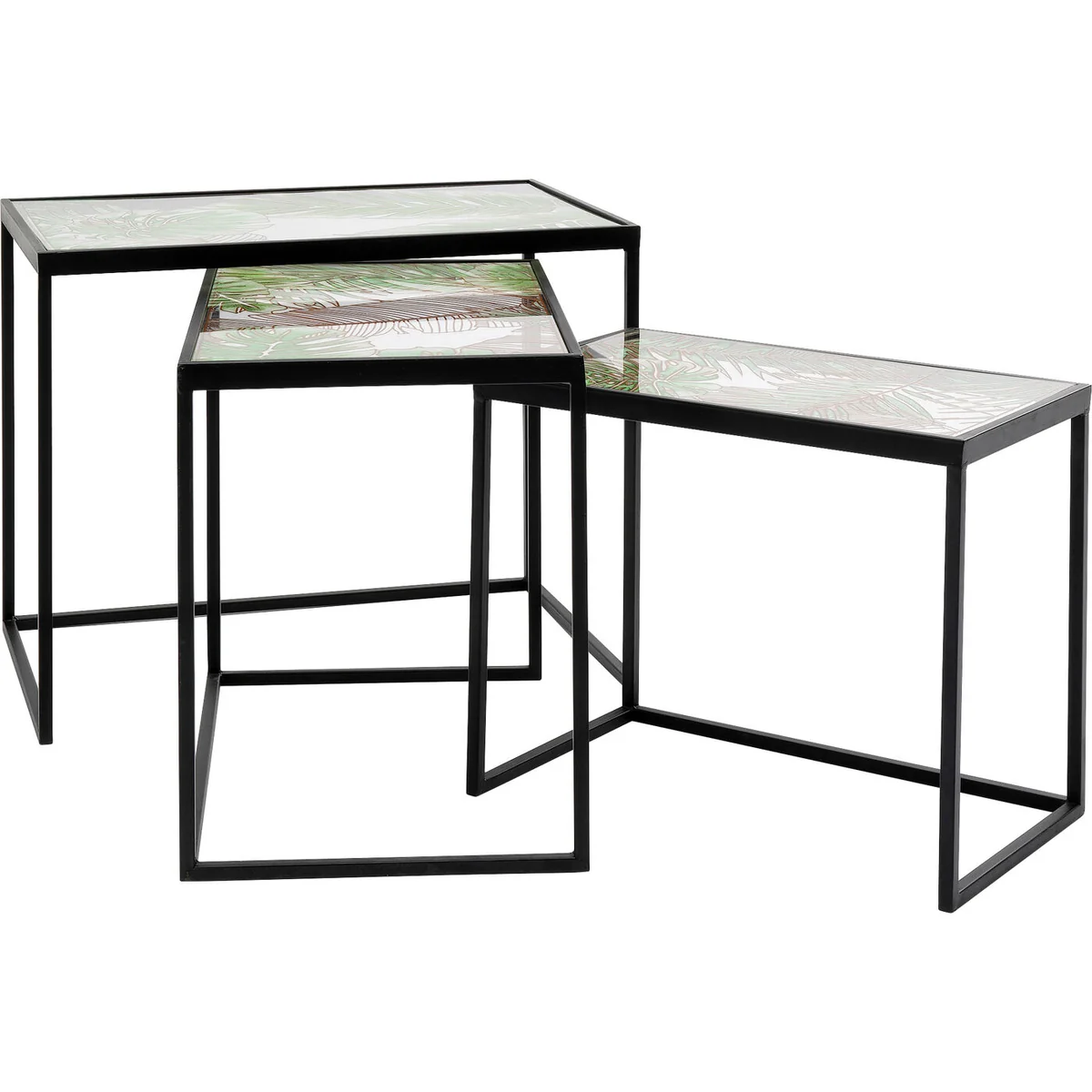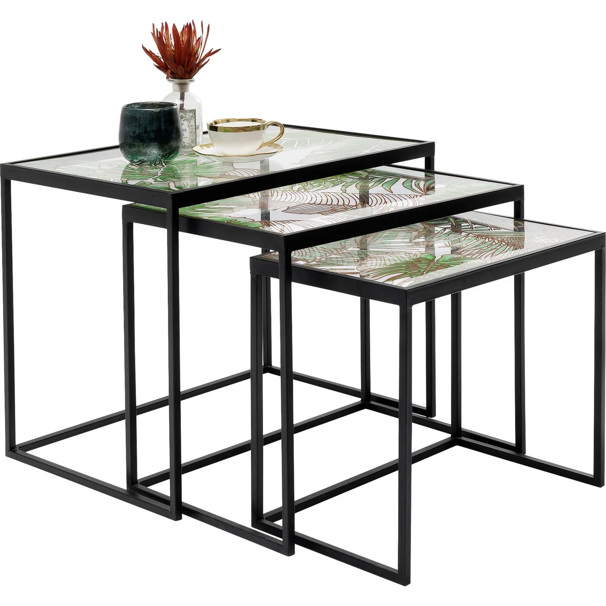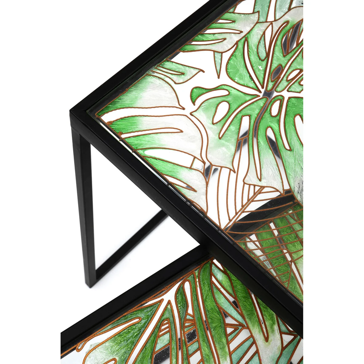â— Black side tables made of metal and glass in a set of 3 â— Side tables with a jungle motif are modern eye-catchers â— Three times the use as a small coffee table, side table for the sofa or nightstand next to the bed â— The trio can be pushed together and rearranged at any time â— Each table top is hand-painted and uniquely decorated