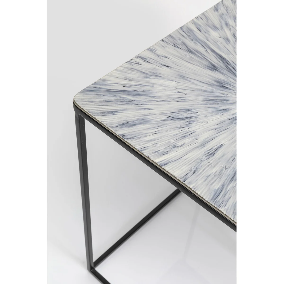 • Set of three square, black side tables with colourful, artistic enamel-look tops • Surfaces with radiant ornamentation lacquered in shimmering shades of grey, bronze and greenish blue • Multifunctional furniture is the order of the day: the smaller tables can be slid under the large ones and used as required • One table set and many furnishing options: as a coffee table, as a bedside cabinet in the bedroom and as a side table to go with your reading chair • Solid, stable steel frame and robust tabletops made of lacquered aluminium
