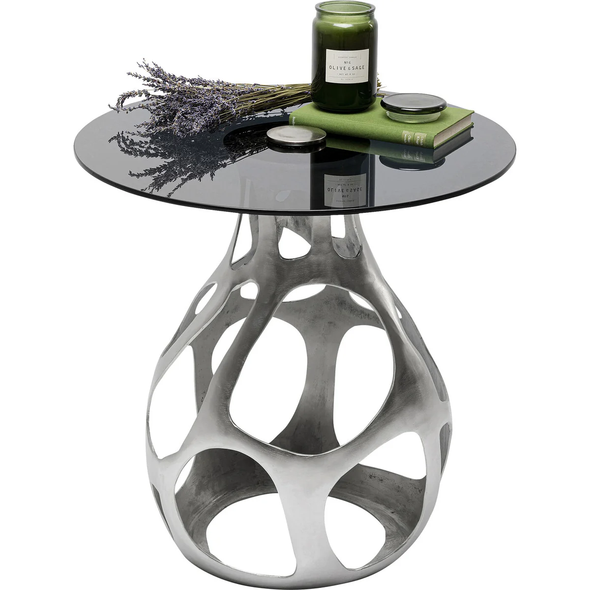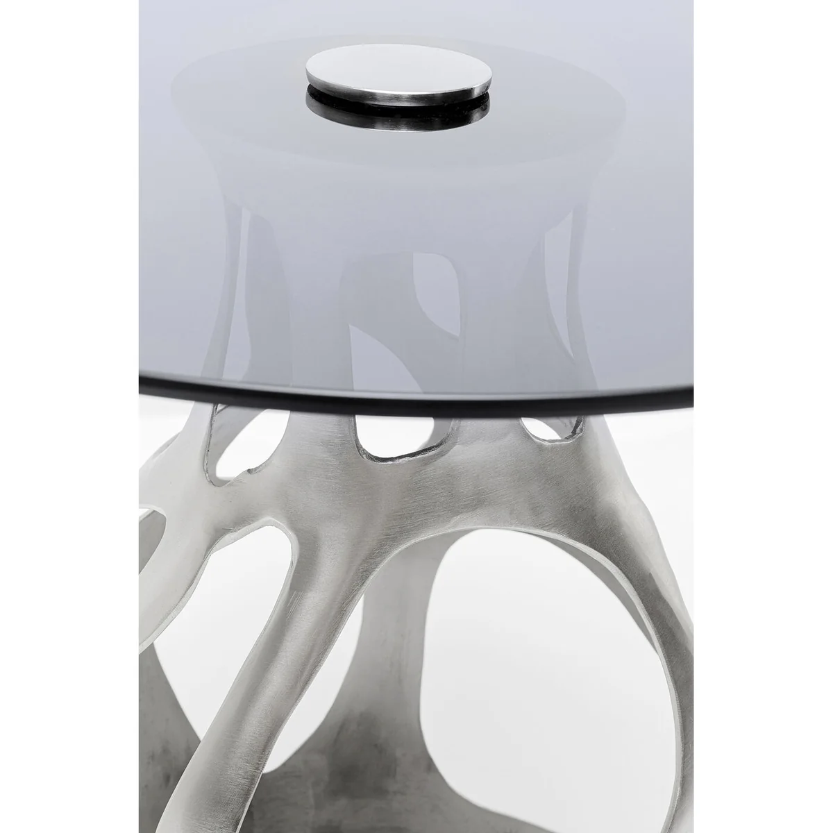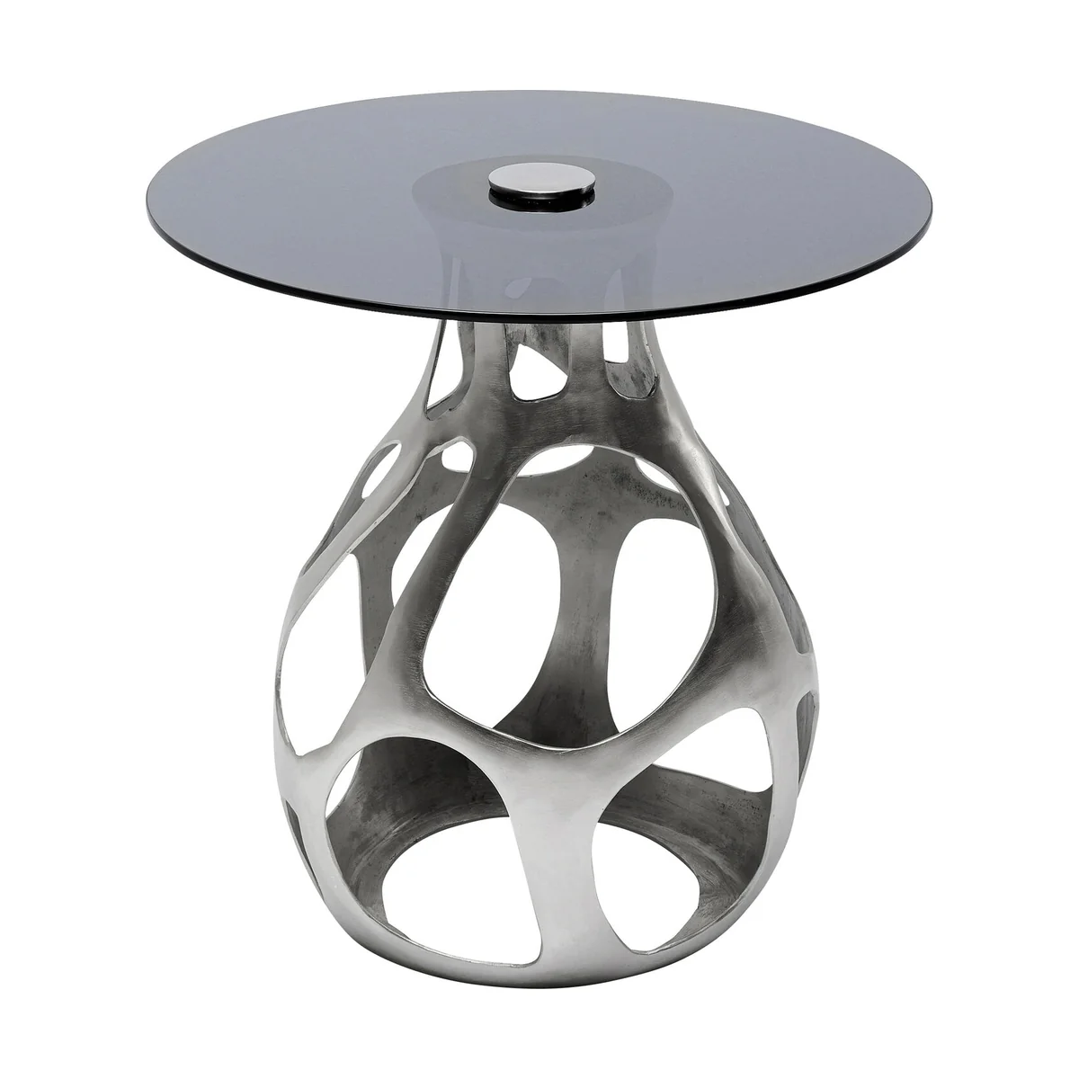 It's not for nothing that interior designers occupy themselves with the theory of harmony and well-being. There is no question that rounded, organic shapes contribute to a cosy feeling of well-being. Nature has given us this. The design of this unusual glass table with its frame made of nickel-plated aluminium and a top of toughened safety glass is also in line with these insights. Premium materials and the quality of a designer piece of furniture make this living room table a glamorous centrepiece in your home. â— Side table in silver made of glass and metal, 60 x 60 x 60 cm (H/W/D) â— The sculptural, organically shaped central base of the table turns it into an artistic furnishing object â— A unique piece that is partly handcrafted (table base). Slight deviations from the illustration are possible â— The combination of a gold-coloured base and smoky brown tinted glass stands for elegance and flamboyance â— Can be used in any room, whether next to the sofa and armchair, in the hallway and study as a surface to put stuff on, or next to the bed