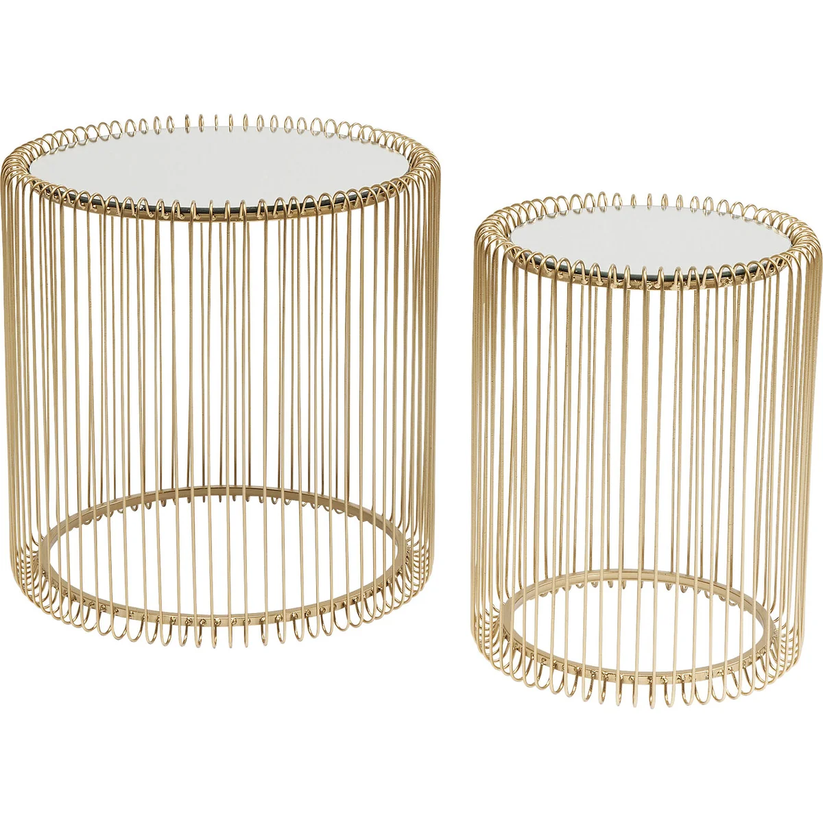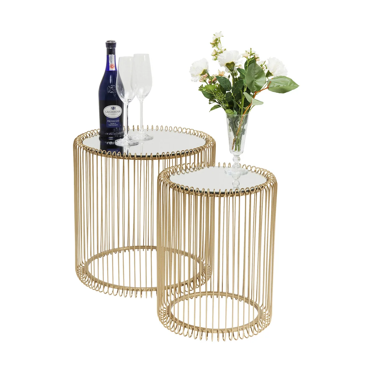 • A side table set with a high glamour factor: mirror table surfaces and the delicate braided wire construction in a shimmering brass look are an elegant style upgrade • Small tables are perfect for a quick change of style in your home: quickly placed in the hallway, in the bathroom or next to the bed so that every little corner gets a little shine • Two flexible side tables like these can fully replace the coffee table in small apartments • Mirrors and brass go very well with upholstered furniture or cushions made of velvet • Thanks to the graphic wire frame, the tables are almost transparent and also allow a good view of patterned carpets or kilims