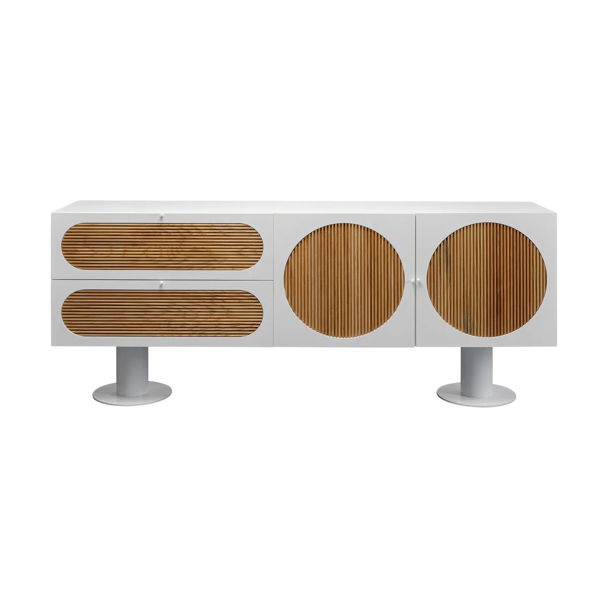 Streamline rooms with the Atomic white sideboard, featuring a smooth finish and simple rectangular shape that suits dining rooms, hallways or living areas. Ample storage keeps belongings neatly arranged, delivering a clean, modern aesthetic. Pairs well with other pieces from the Atomic collection for a cohesive look.