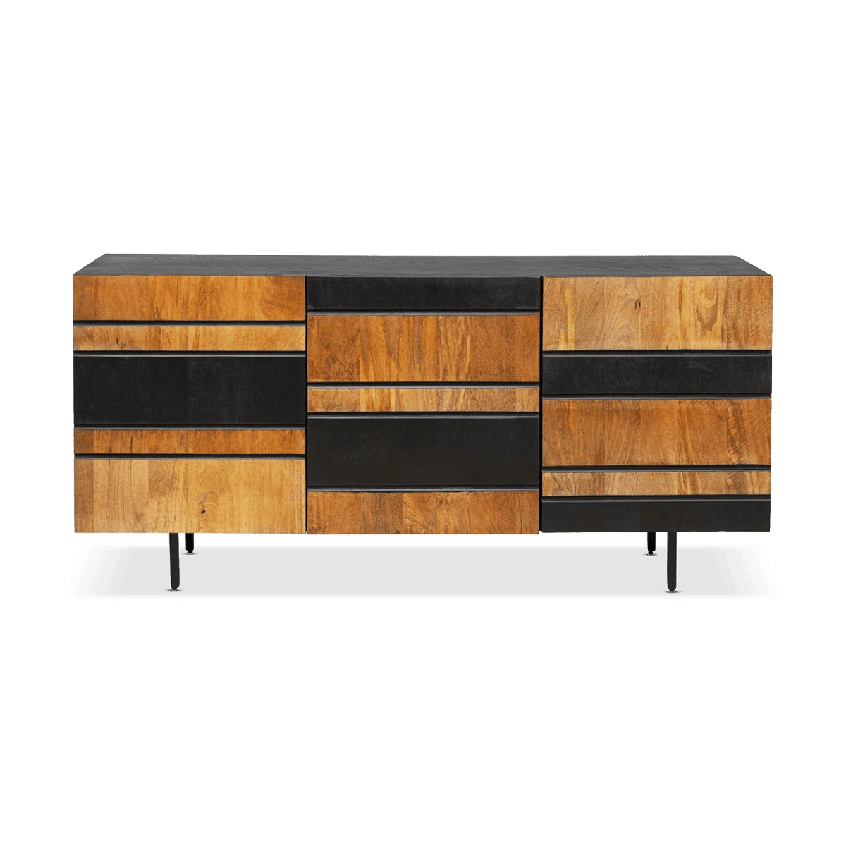 The handcrafted sideboard made of wood is an enrichment for every living room. The eye-catching front design with natural-coloured and black lacquered sections gives this distinctive piece of furniture a homely and modern look. The sideboard offers sufficient storage space for books, crockery or decorations. With its high-quality workmanship and individual look, this sideboard is an investment that you will treasure for many years to come.