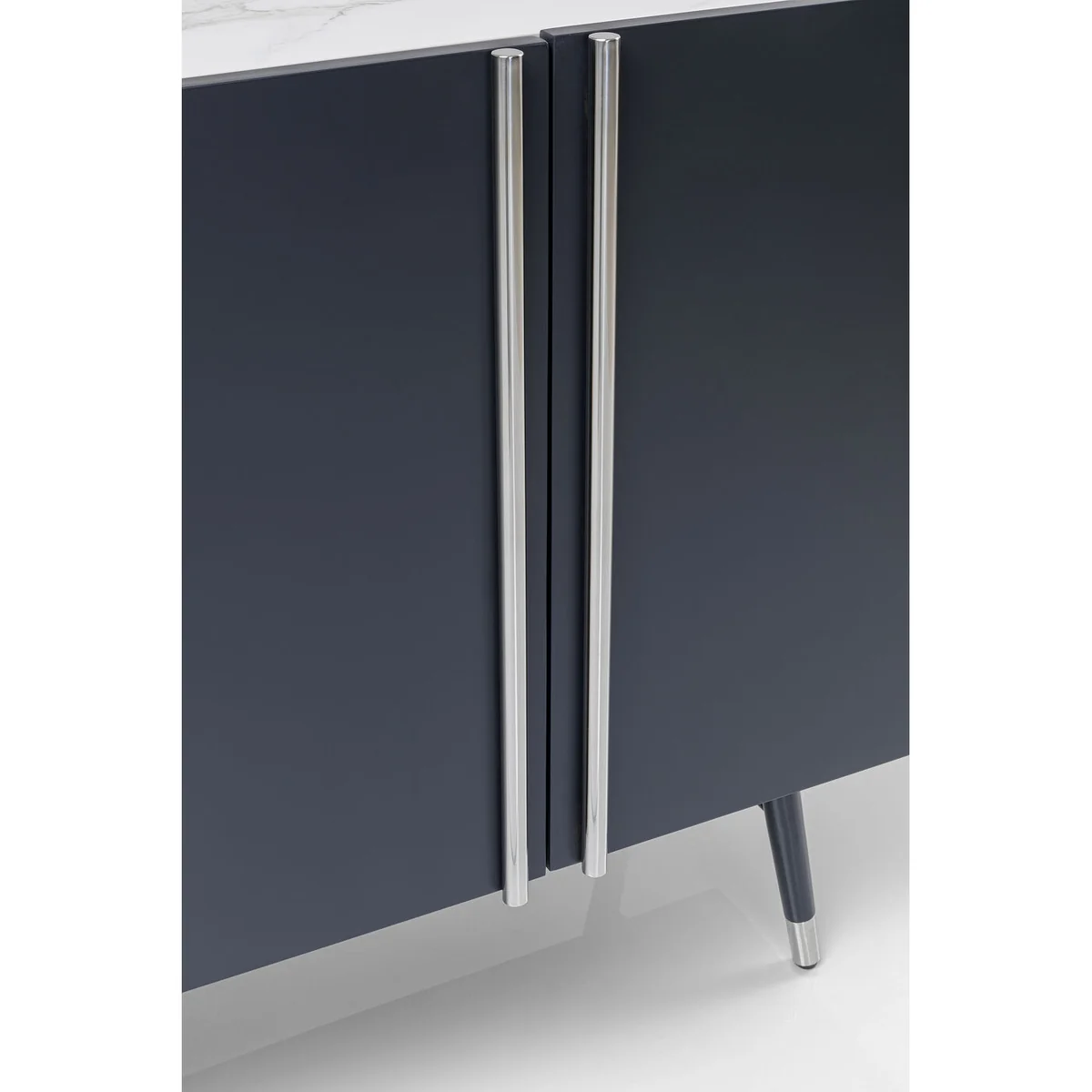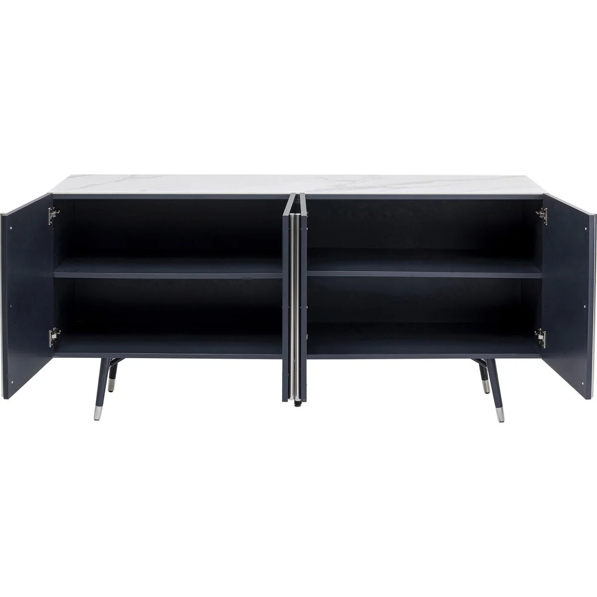 - A modern sideboard in dark grey with silver-coloured highlights and marble look - Easy-care top made of safety glass - Exclusive designer sideboard created by Danish furniture designer Morten Georgsen for KARE - Practical storage space in large compartments behind four doors - The two shelves can be adjusted in height according to individual needs