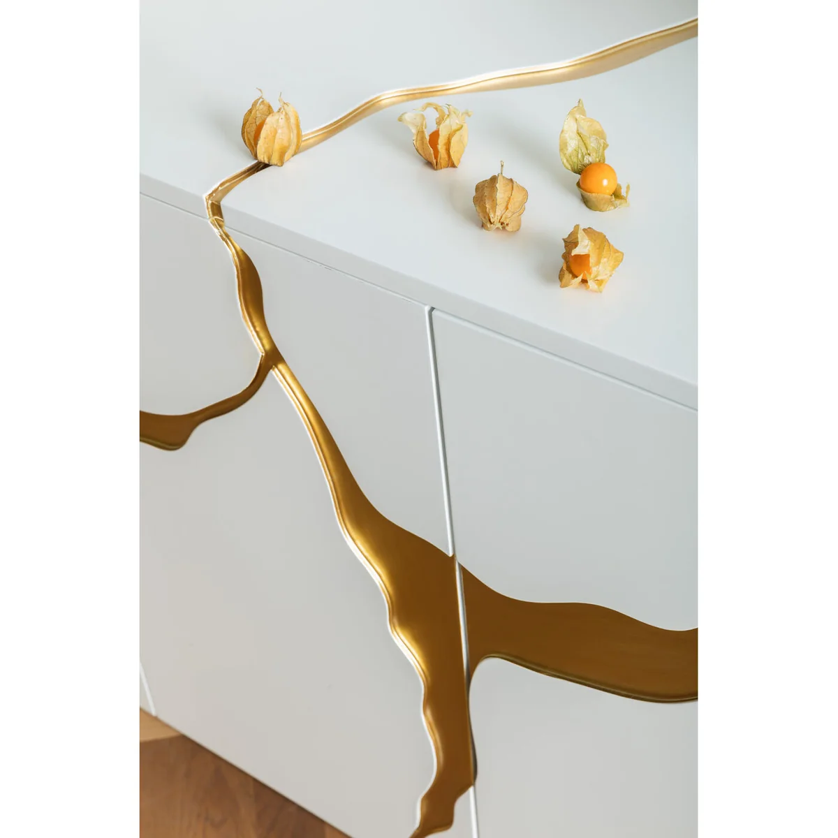 Our sideboard stands out with its unique cracked gold pattern, contrasting beautifully against the pure white background. Sized at 165x80 cm, this piece offers ample storage space without compromising on style. The robust MDF construction ensures long-lasting durability.