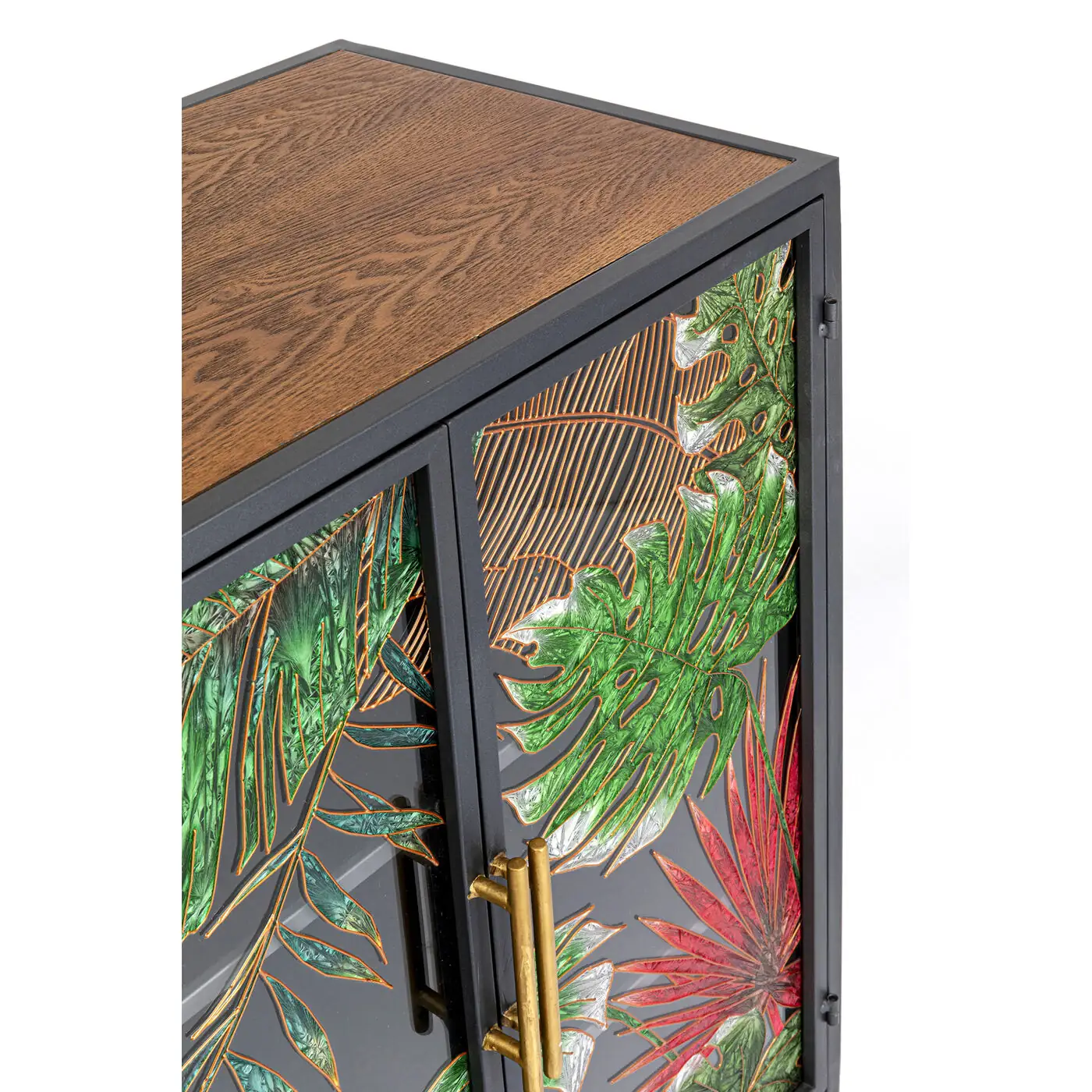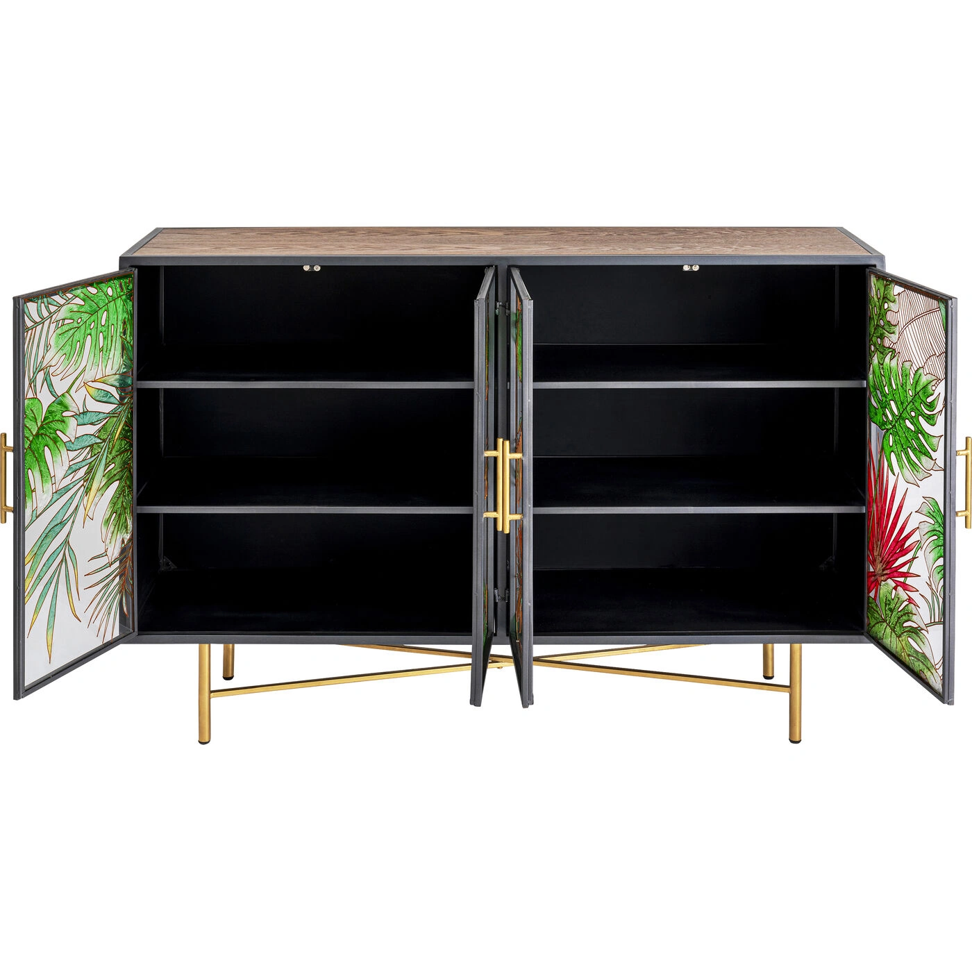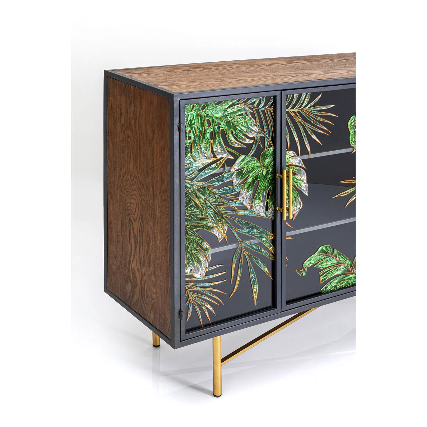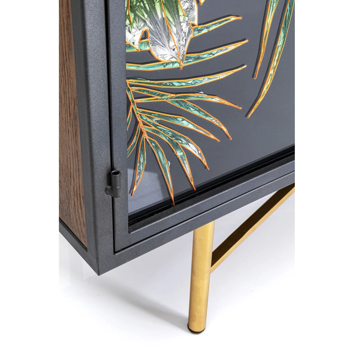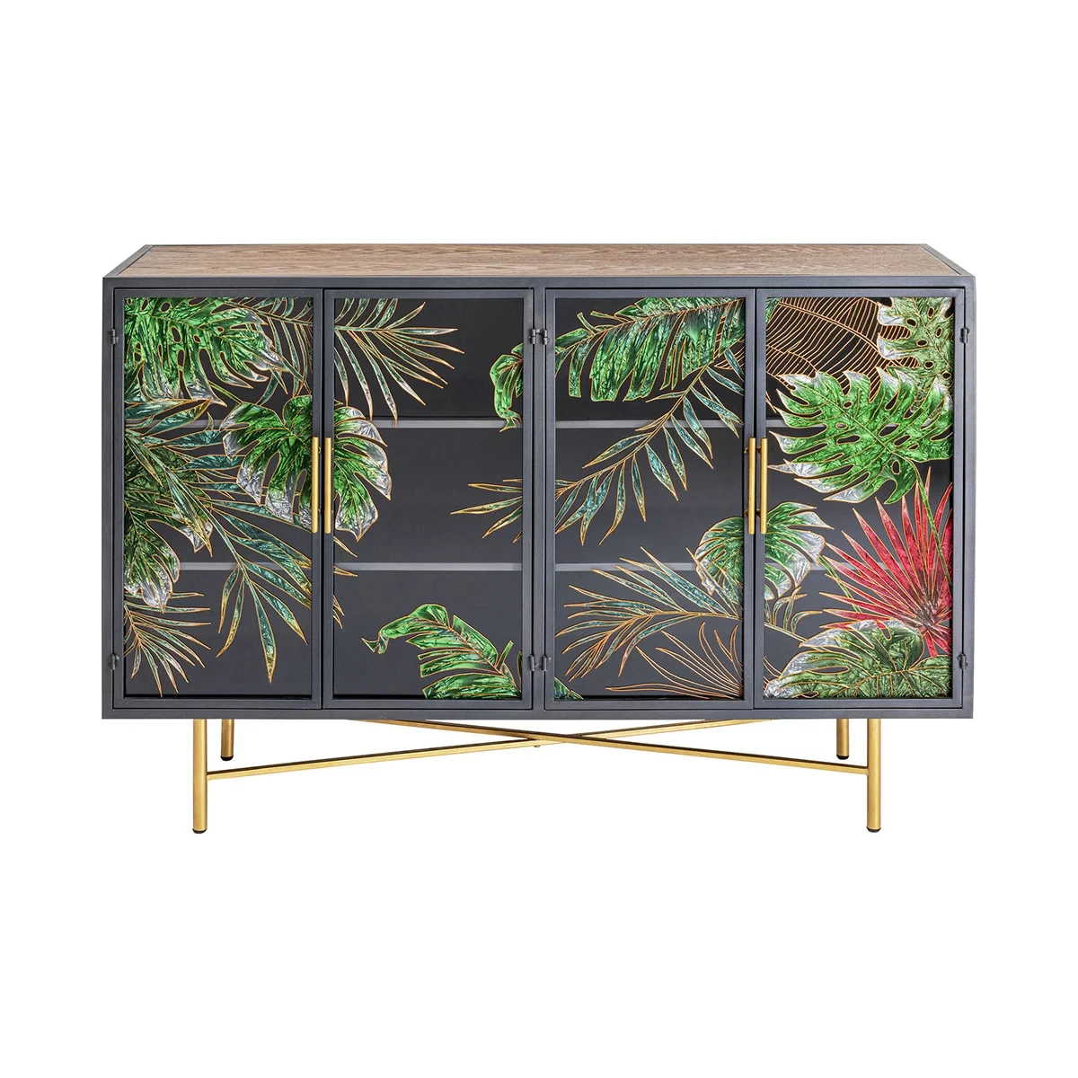 This sideboard easily manages to look both natural and glamorous at the same time. The sturdy body made of ash and the hand-painted decorations on the glass doors radiate jungle vibes, while the black metal frame and the golden handles and feet provide just the right amount of elegance. Not everyone has such a beautiful sideboard in their living room - so it's only appropriate to decorate this treasure with plants and ornamental objects as eye-catchers.
