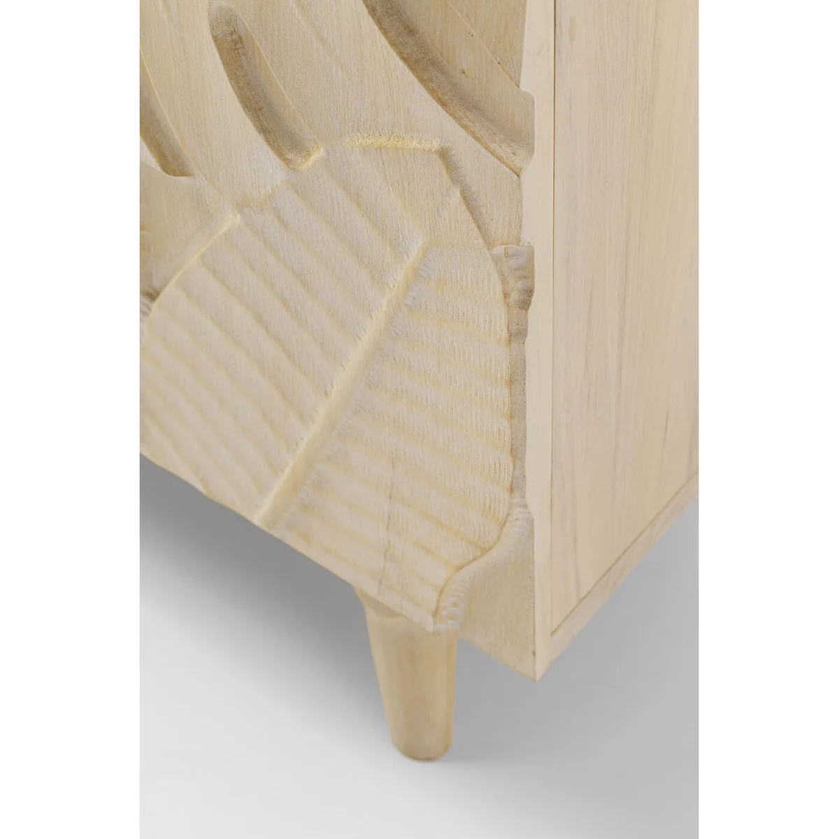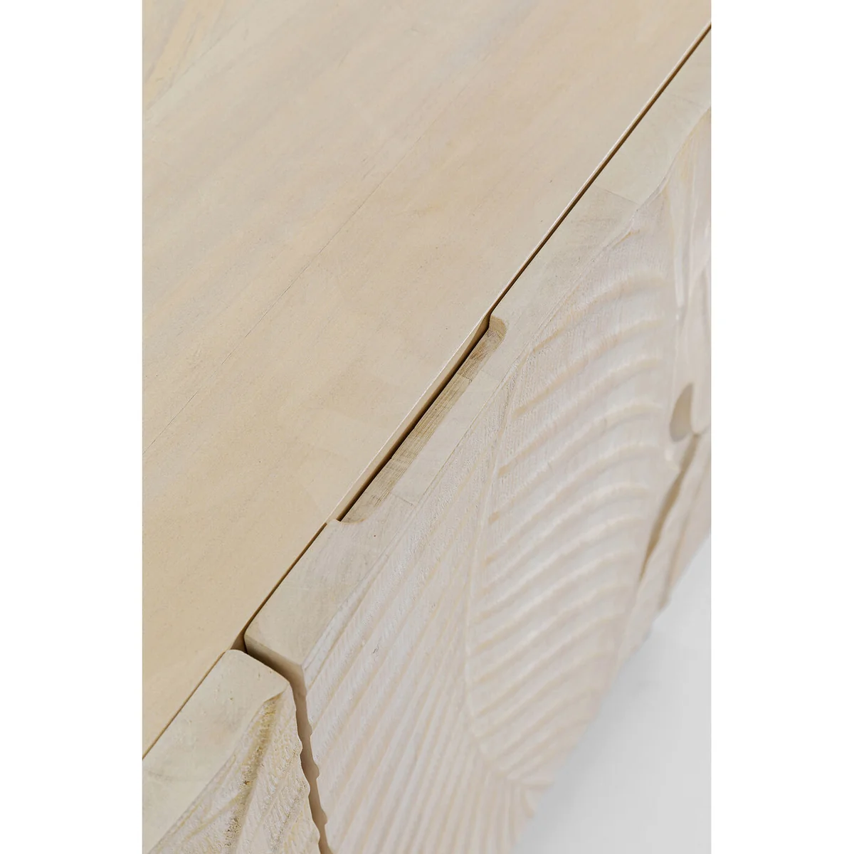 This beautiful sideboard made of light-coloured solid wood is perfect for lovers of the natural interior style. The three-dimensional front of the sideboard is decorated with artistic leaf motifs, which gives this piece of furniture a vibrant touch. With 3 large compartments it offers plenty of storage space for all your bits and pieces. This sideboard is timeless and will blend harmoniously into any interior. It is a beautiful statement article of furniture for anyone who values exceptional and functional design. Since it is made of solid wood except for the back panel, this sideboard will give you many years of service. And even at the end of its life, wood can be easily returned to the recycling loop.