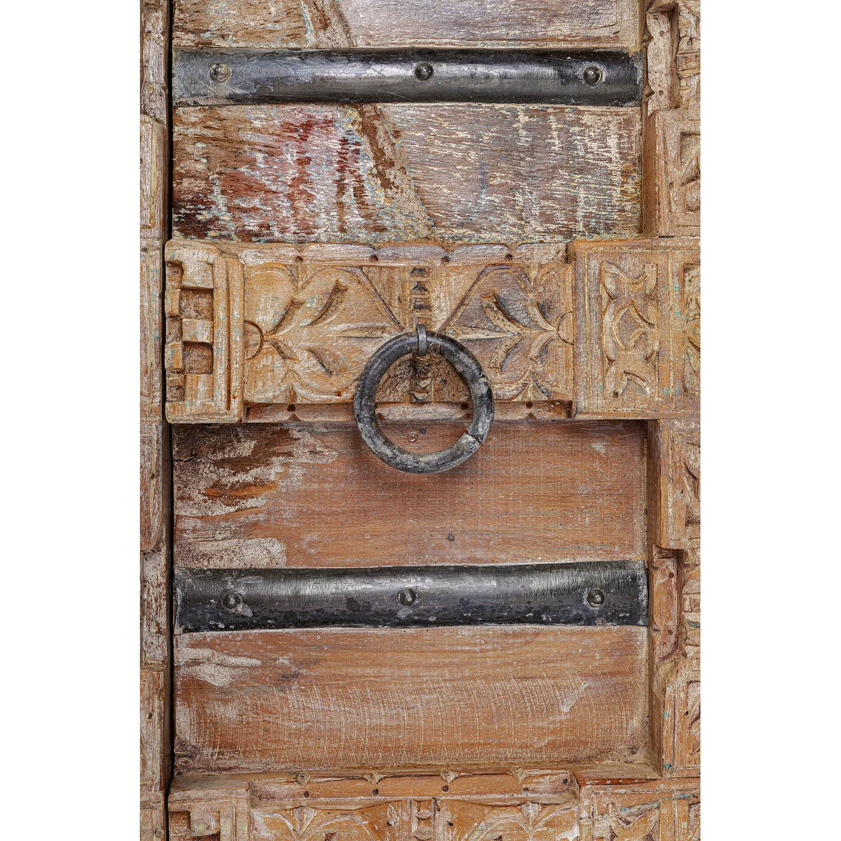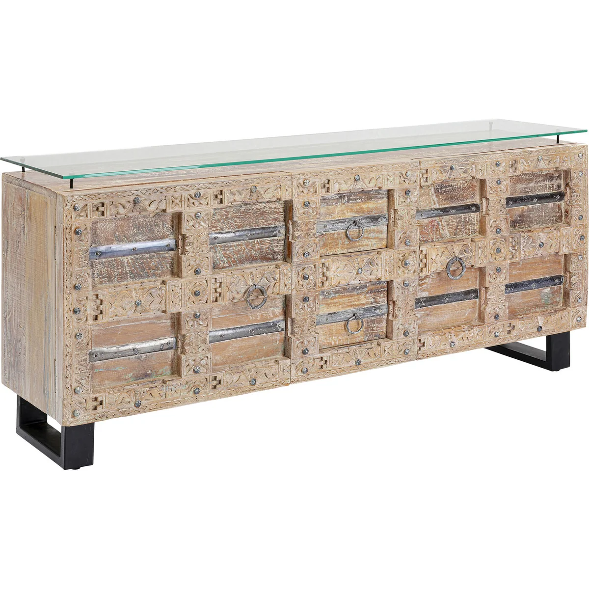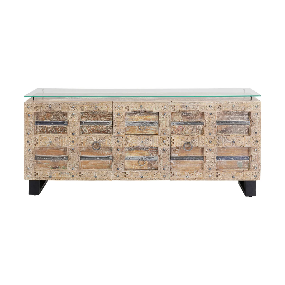 ● Sideboard with an exceptional ethnic design, made of waxed solid wood, lacquered steel and glass ● A handcrafted showpiece that offers plenty of storage space behind two doors and in two drawers ● The carvings on the furniture front in the style of old Indian doors are the special highlight ● Its unique character makes this sideboard easy to combine with other furniture and interior styles ● Goes well with sofas in leather and fabric, and with all furnishing colours