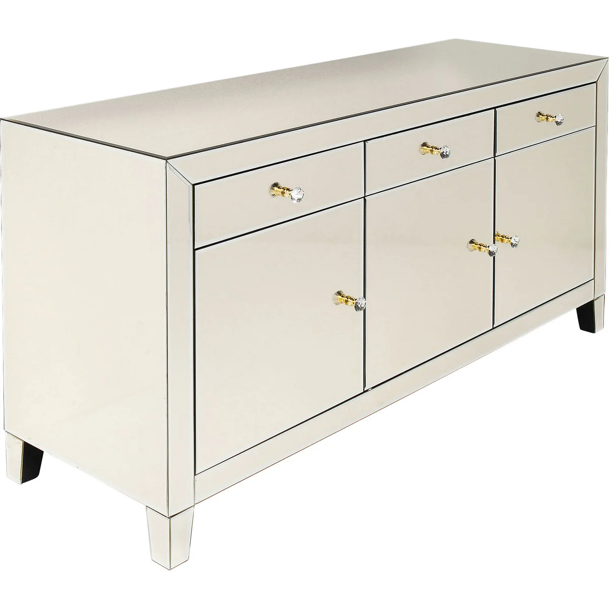● Mirrored sideboard with keypiece qualities, lots of storage space and a delicate champagne tone. ● The glamorous chest of drawers adds glamour and light to any room and creates interesting mirror reflections. ● The champagne tone is particularly warm. ● The linear form makes this luxurious piece of furniture look wonderfully modern, and as a stand-alone item Luxury fits into almost any style of furnishing. ● Chic and practical: plenty of storage space in the three drawers and behind the cupboard doors.