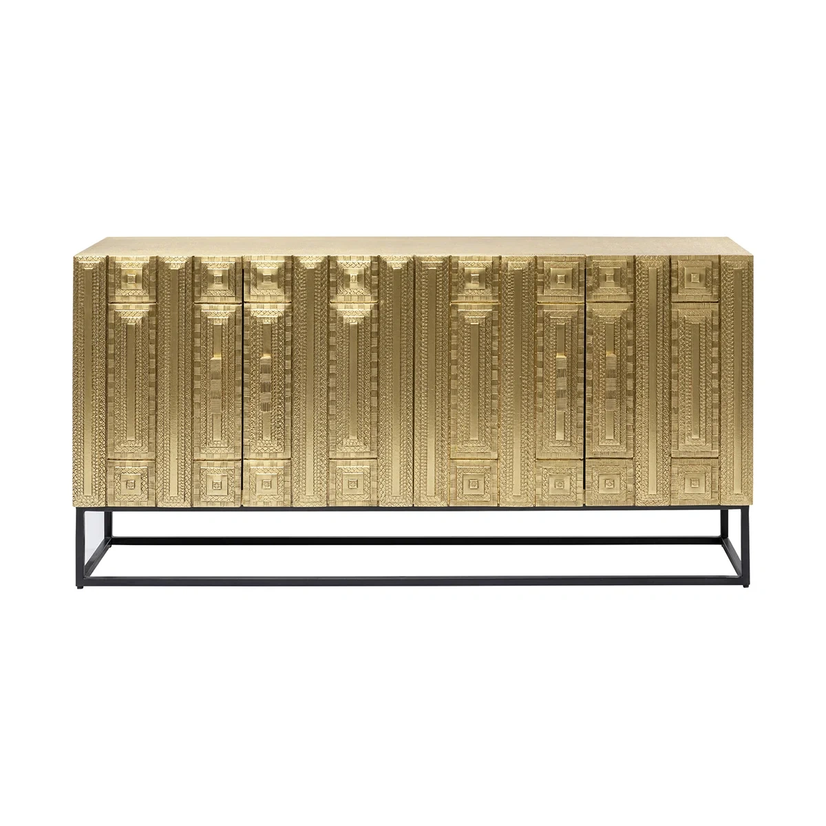 Bring more than a touch of luxury into your home! This elegant sideboard captivates with its striking contrasts between the regal brass and simple black, as well as between the straight-lined shape and the ornate, partially handcrafted front. The soft-close function of the doors is also a distinctive feature.