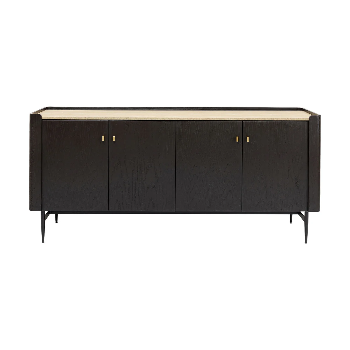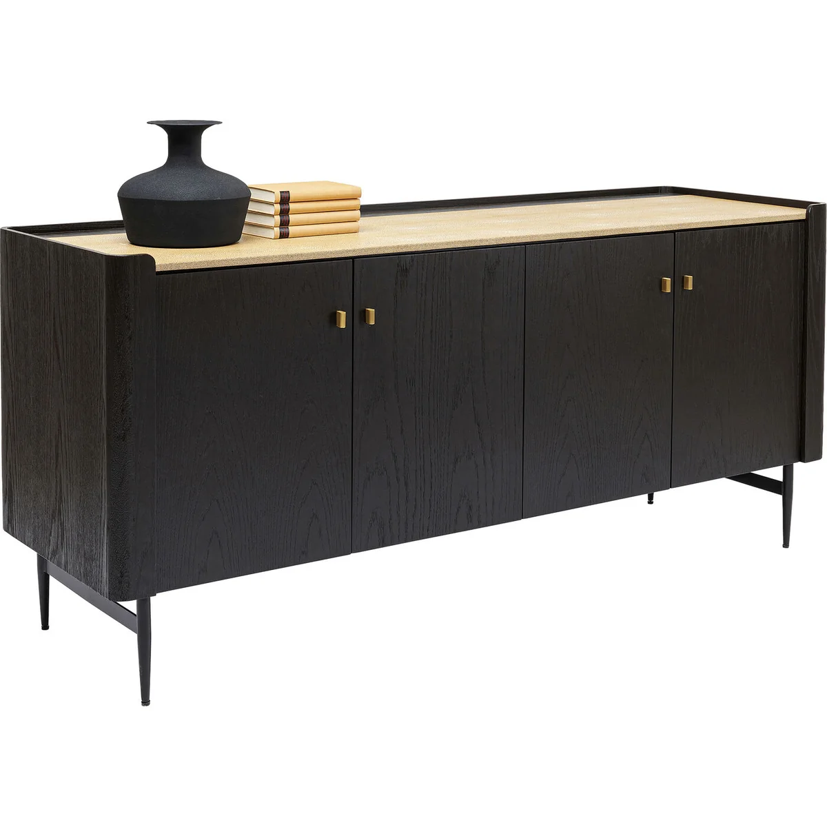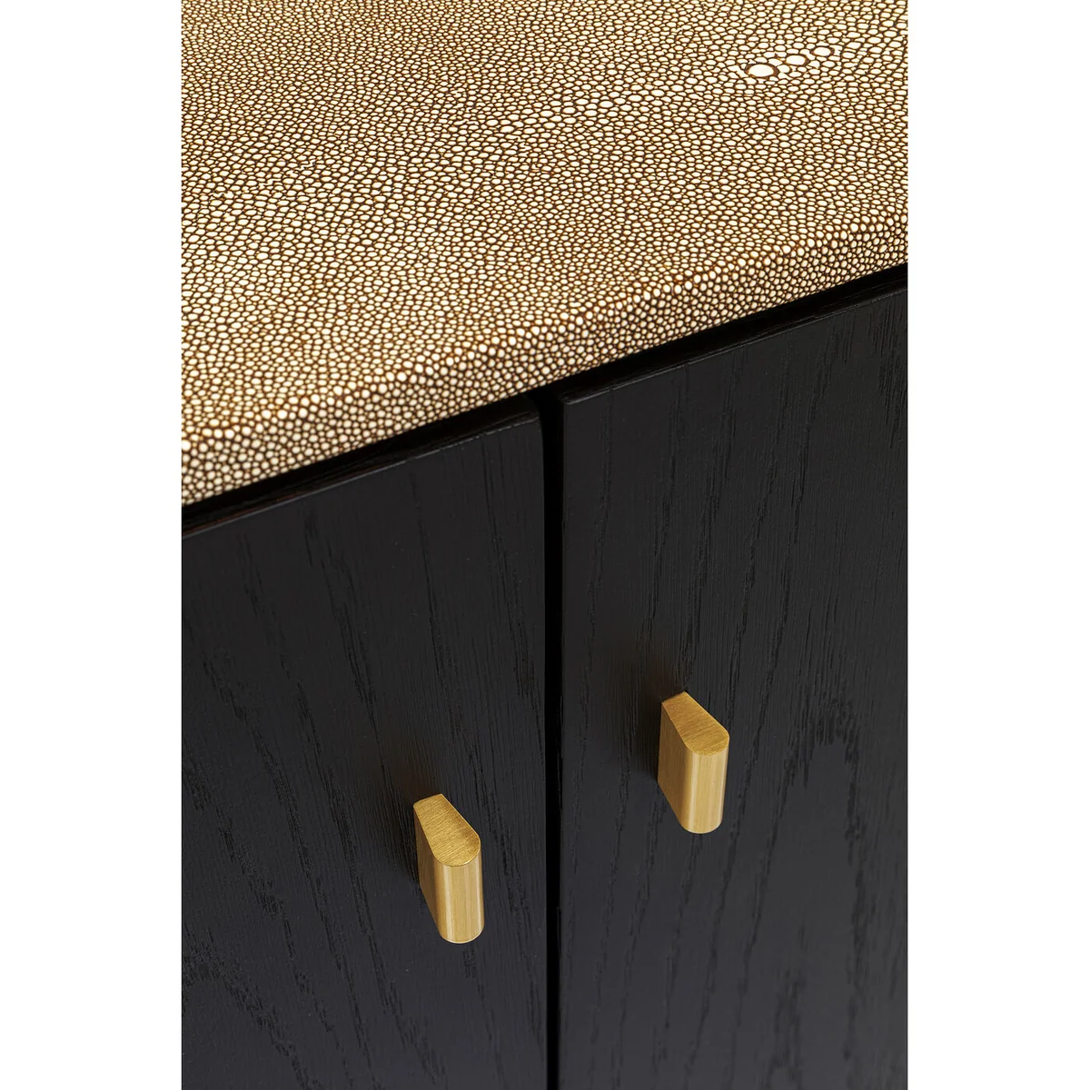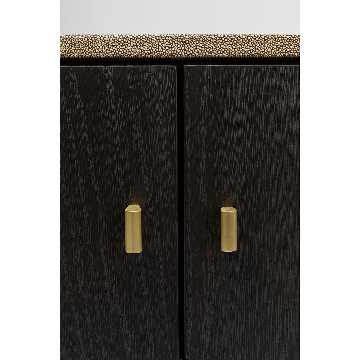 - Highly elegant sideboard, manufactured from selected materials in the tradition of the finest Italian furniture design. This furniture collection is handcrafted - The combination of dark brown oak veneer with cream-coloured covers in a fine stingray skin look is full of character - Added value: the soft-close function of the doors and height-adjustable feet to compensate for irregularities in the floor, supplied assembled! - The proportions of the sideboard, which is slightly lower and higher than conventional products, are well balanced - The beauty of this designer furniture also comes from within. Behind the two double doors there is storage space and one fixed shelf each