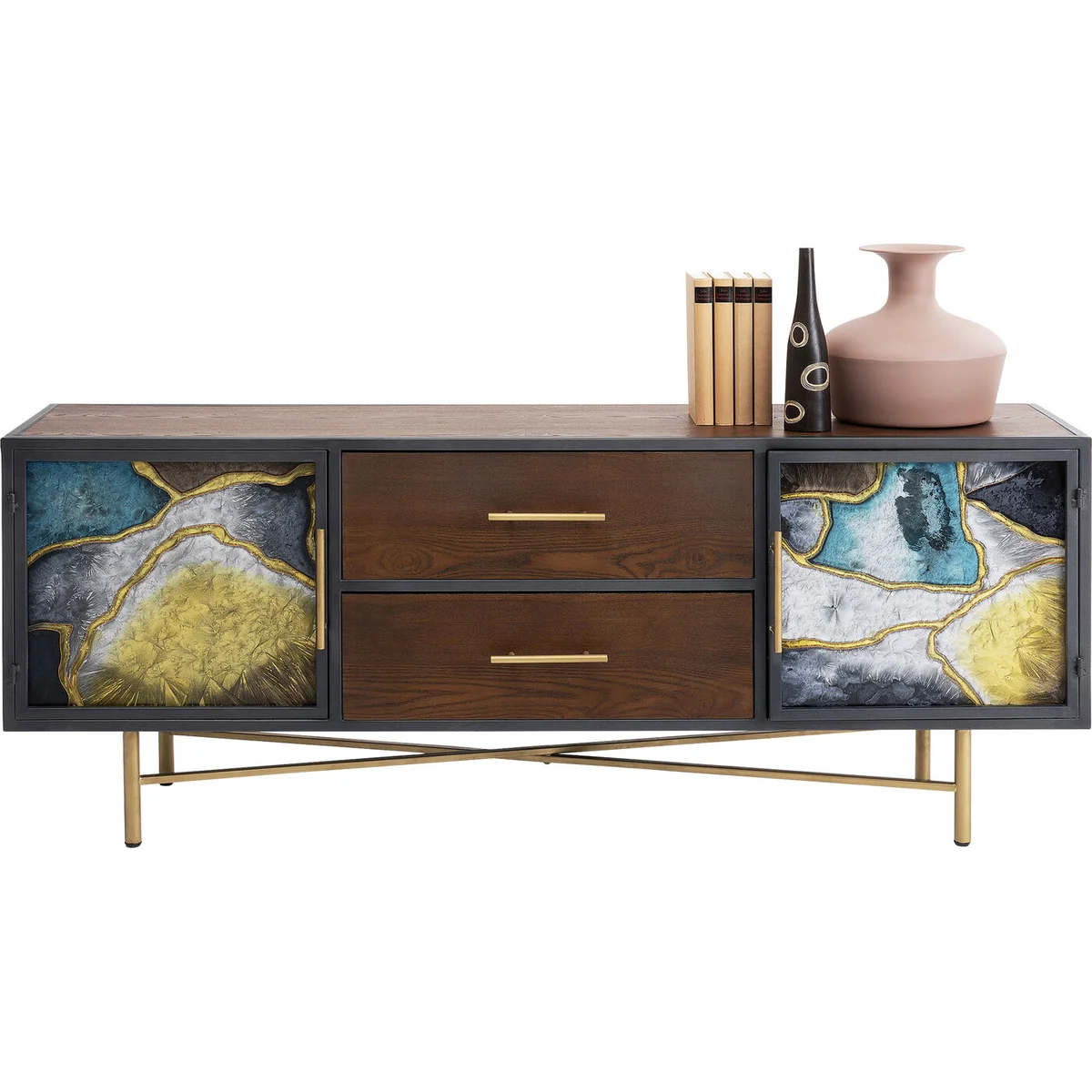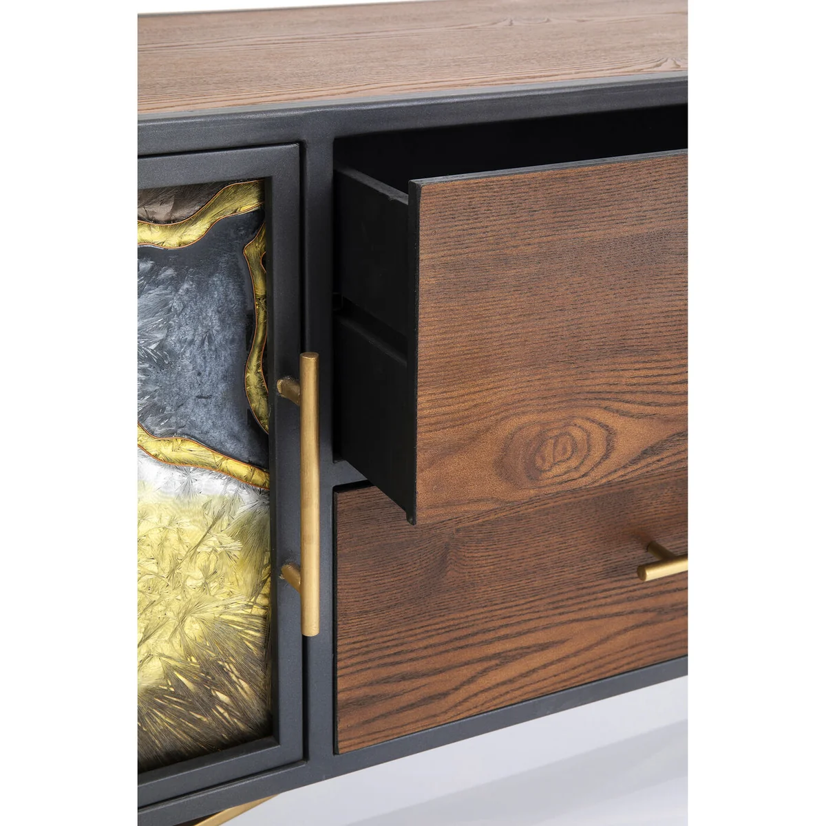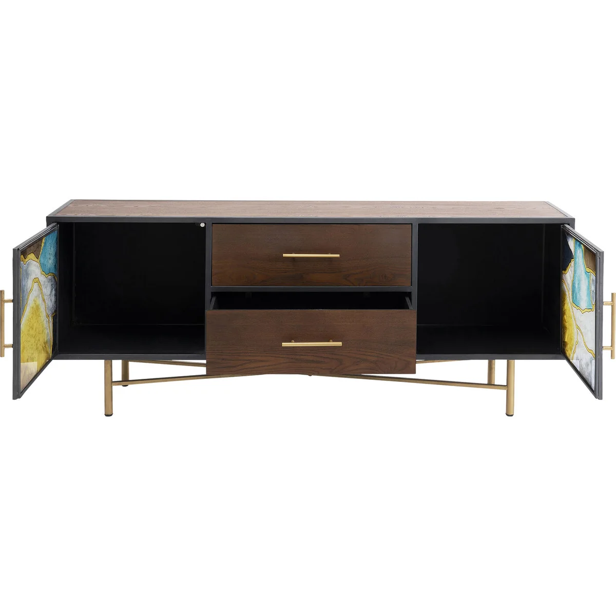 - A brown designer sideboard made of real wood veneer, glass and golden metal - A modern sideboard which is straightforward and artistic at the same time - A flamboyant work of art for the hallway or an empty wall in the living room - Plenty of storage space behind two magnetically closing doors and two drawers - Each glass door is unique and displays a pattern of its own