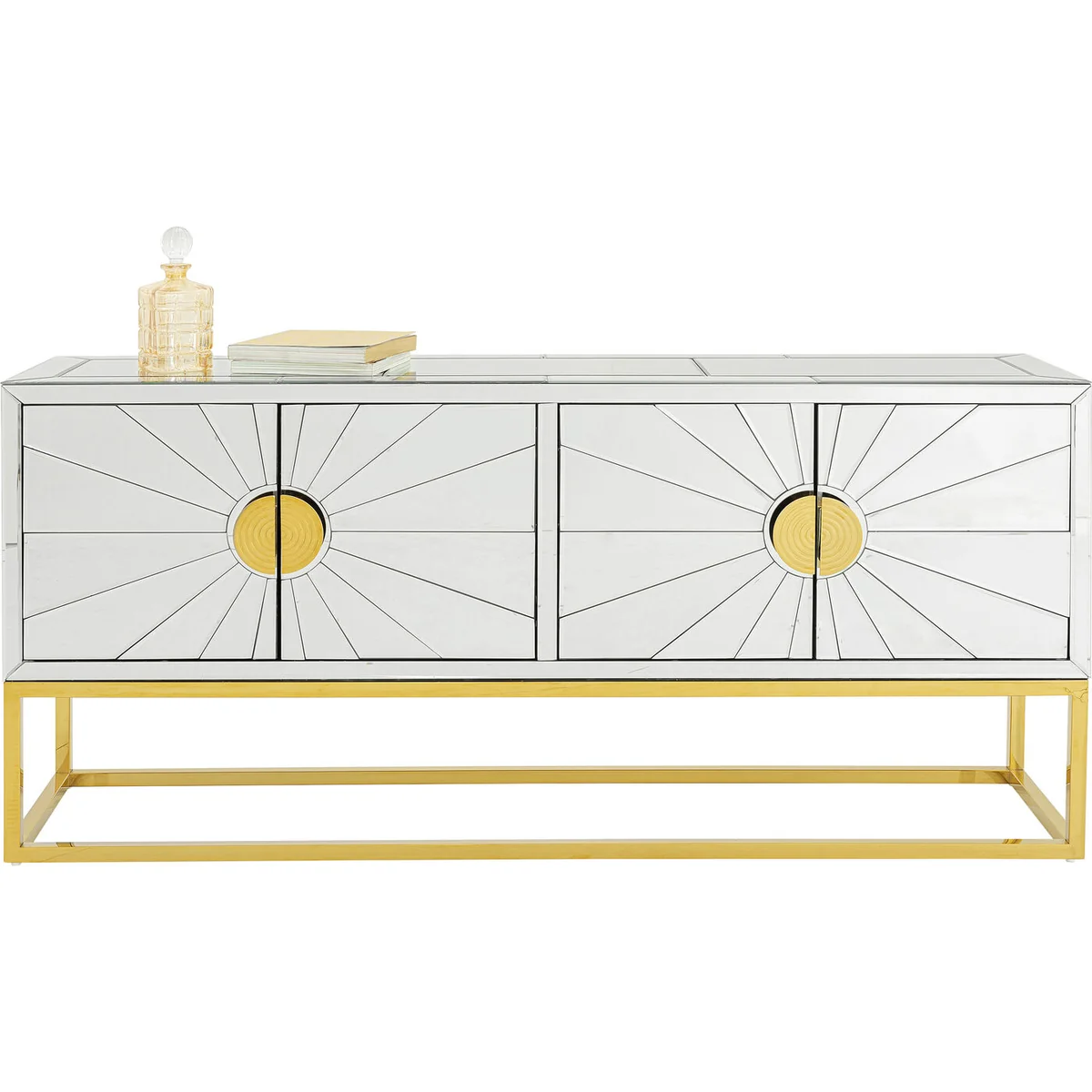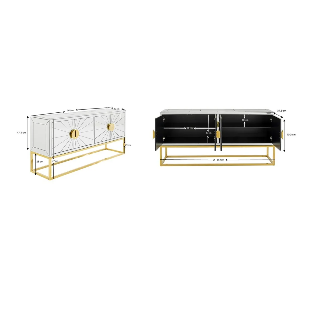Key features of this sideboard include its generous size of 162cm length and 77cm height, offering ample storage space. The mirrored finish not only adds a touch of elegance but also creates a sense of space in any room. The lacquered MDF corpus provides durability and a sleek appearance.