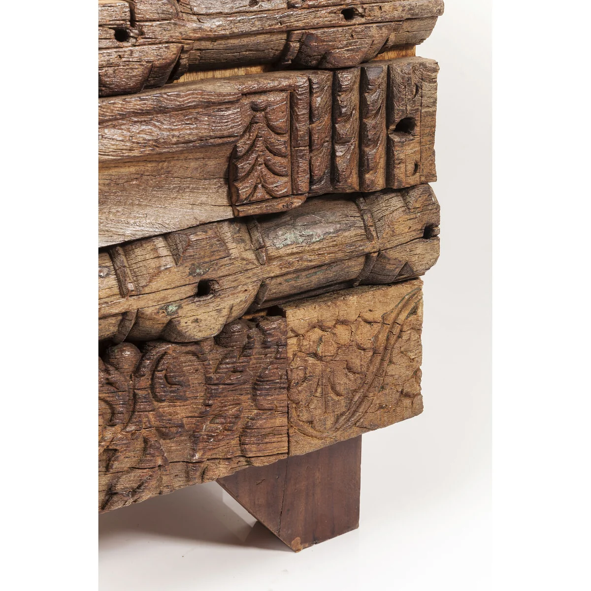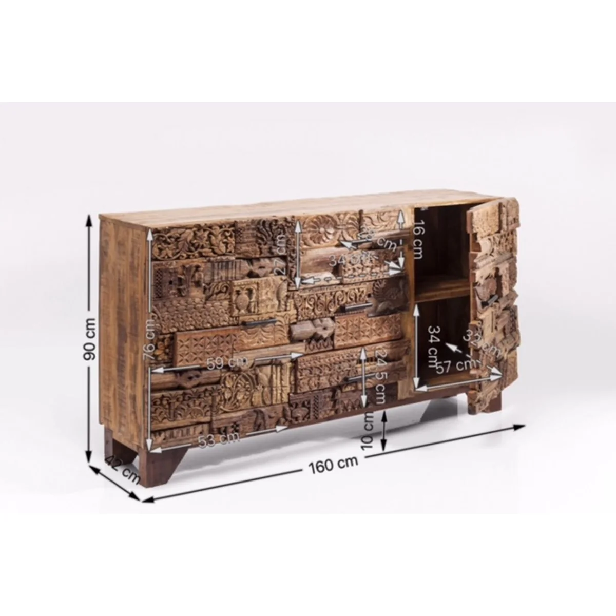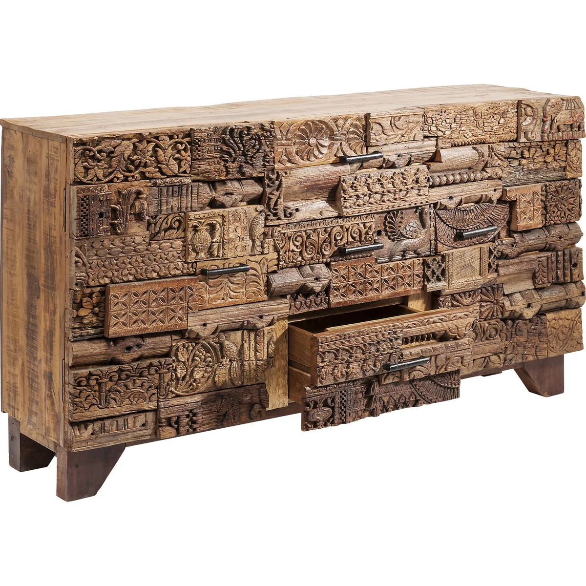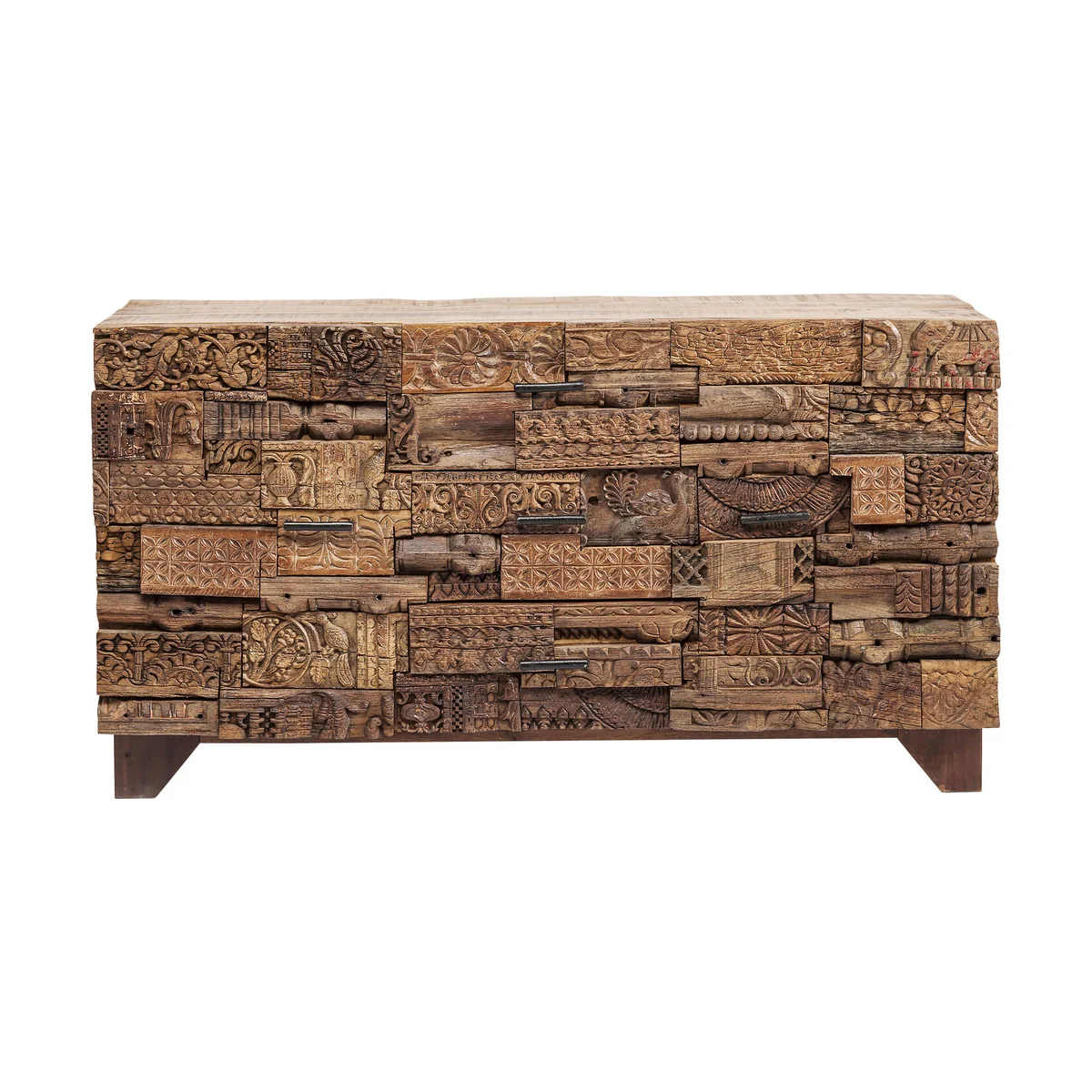 Designed with a puzzle-inspired facade, the Shanti surprise sideboard in brown introduces visual interest through natural wood textures. Doors open to generous internal storage, balancing practicality with warm, organic character. Part of the Shanti collection for a coordinated interior scheme.