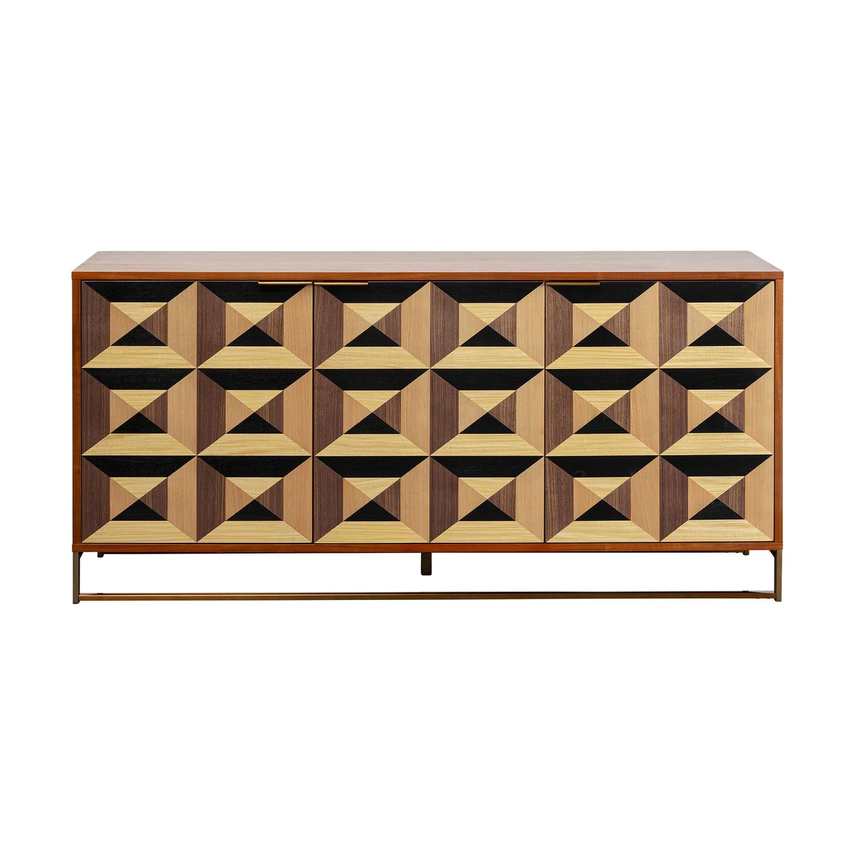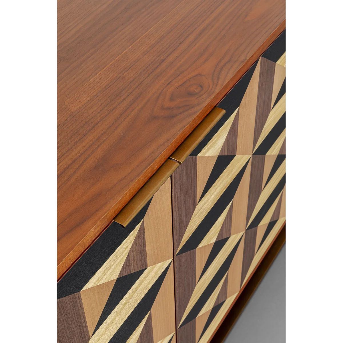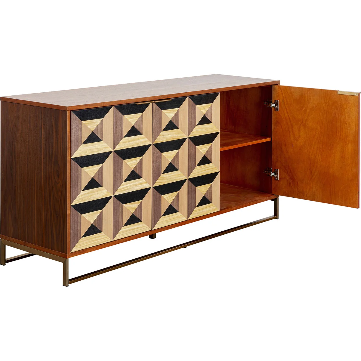 This sideboard measures 160 cm in length, 45 cm in width, and 78 cm in height, offering ample storage space. It features a high-quality ash medium density fibreboard (MDF) corpus and fronts, veneered in walnut color, giving a warm and natural aesthetic.