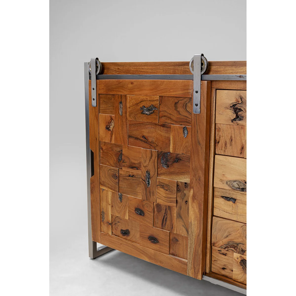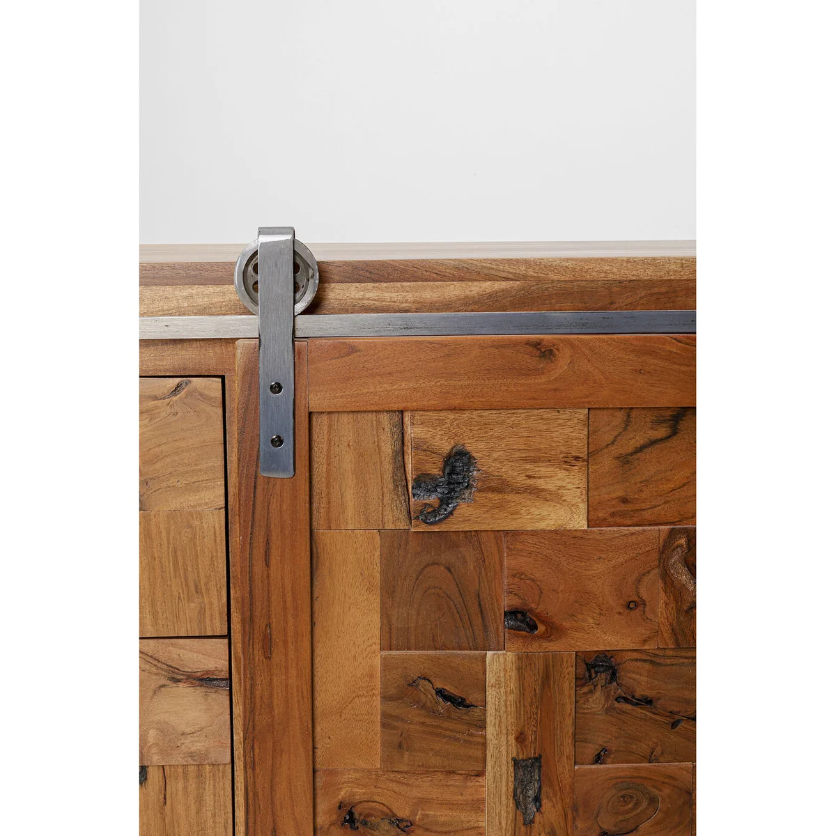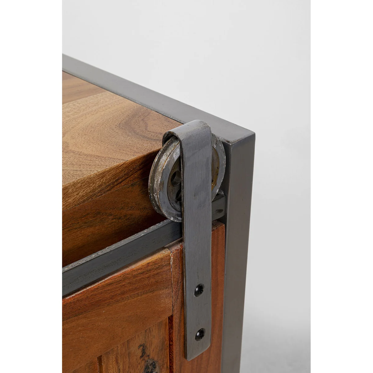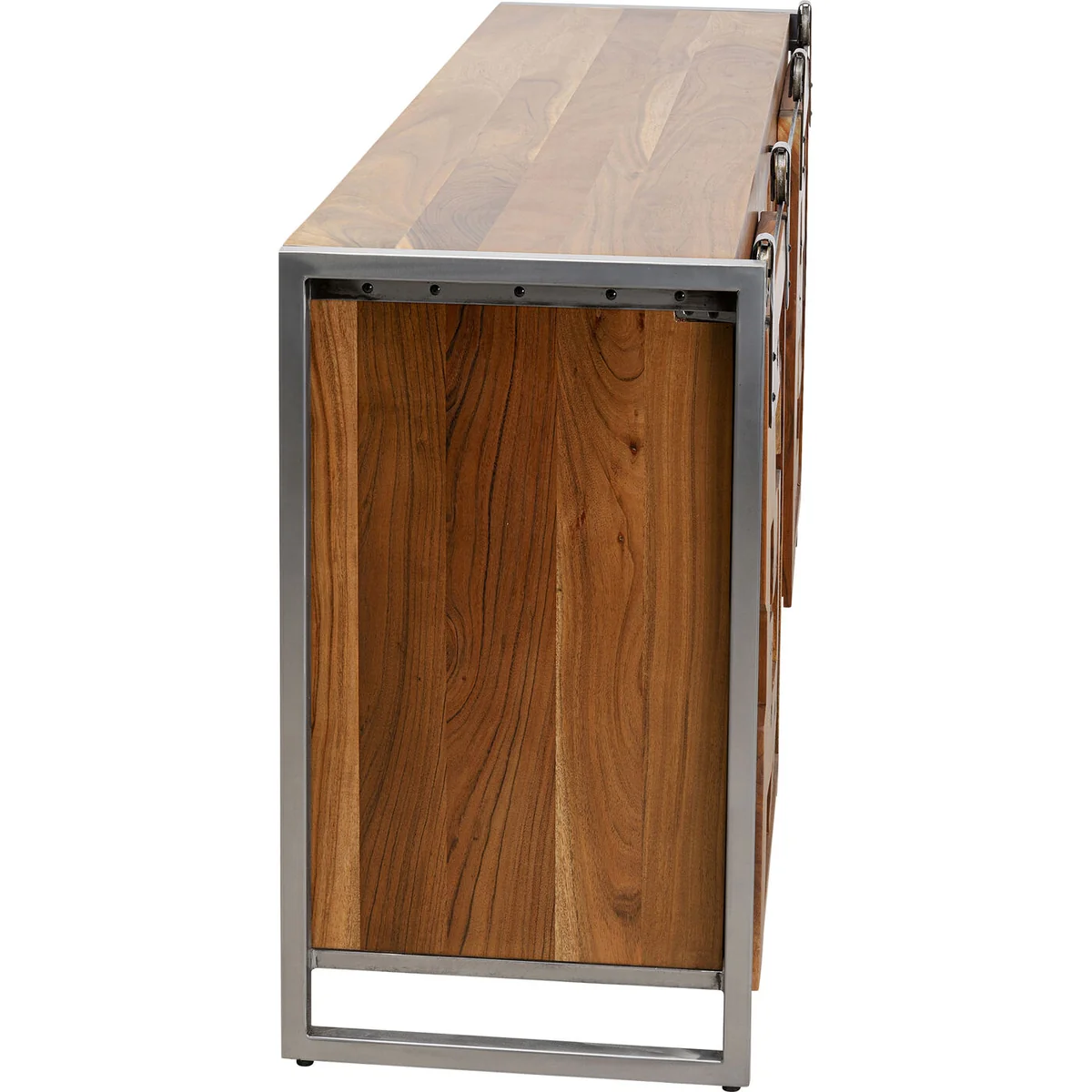 This sideboard is a practical piece of furniture that fits perfectly with different interior styles. It looks just as good in a country house as it does in a loft. With its unique design and the use of solid acacia wood, however, it is above all an attention-getter in any room. The sideboard has two sliding doors and three drawers that allow for flexible storage of bits and pieces. The frame and casters for the sliding doors made of metal, which give the furniture an industrial touch, are particularly interesting. The sideboard is handmade and each one is distinctive.