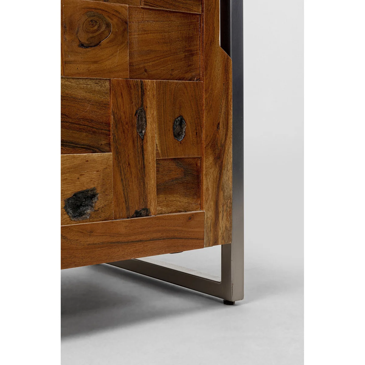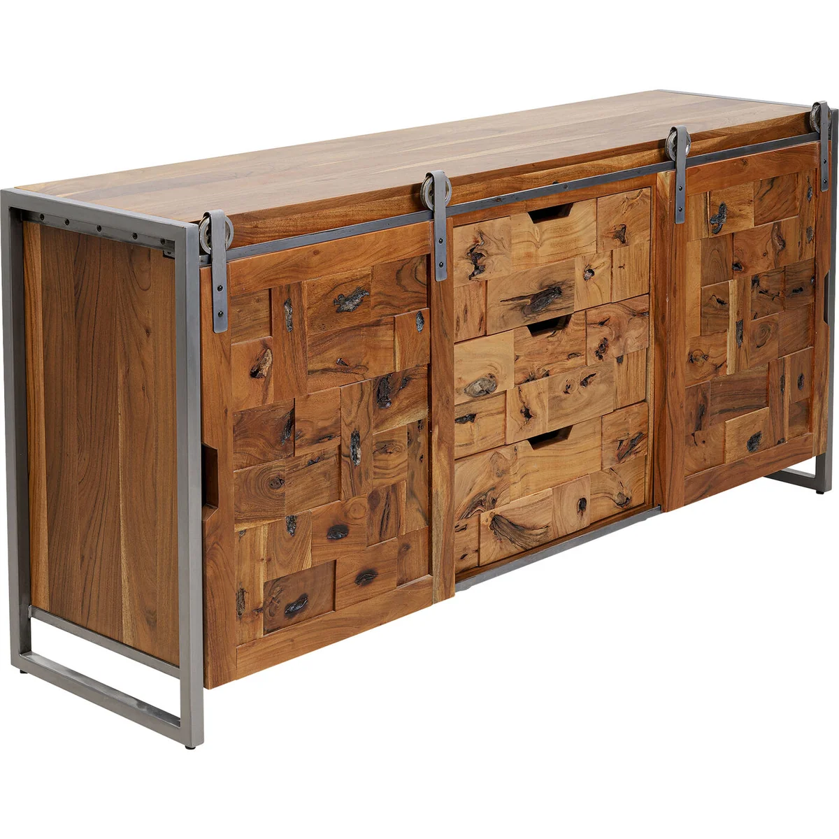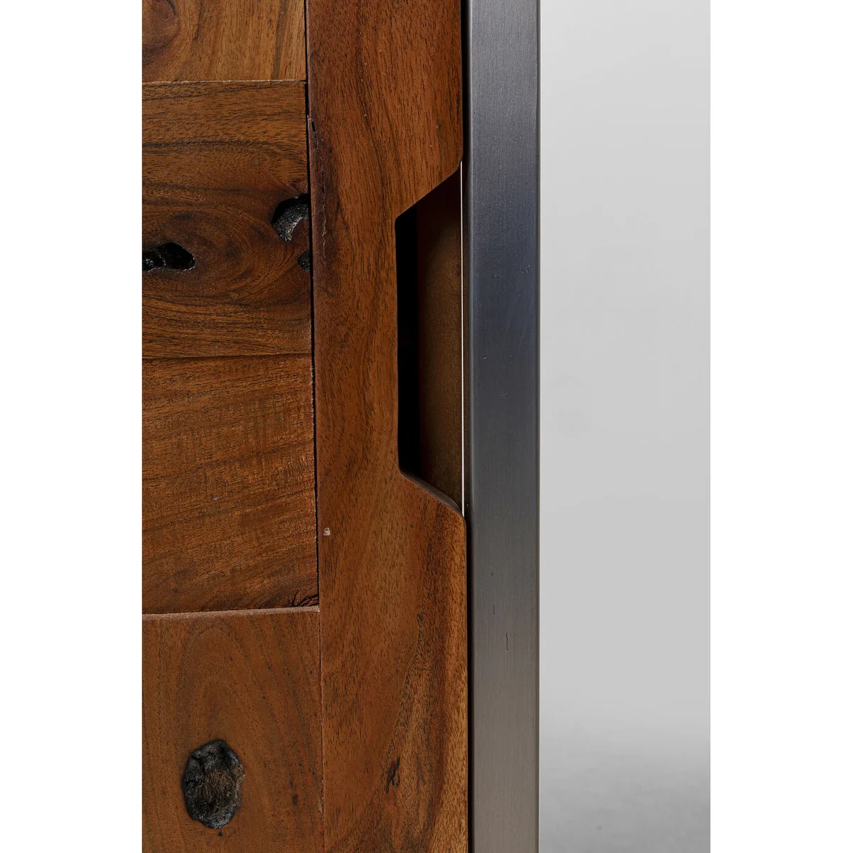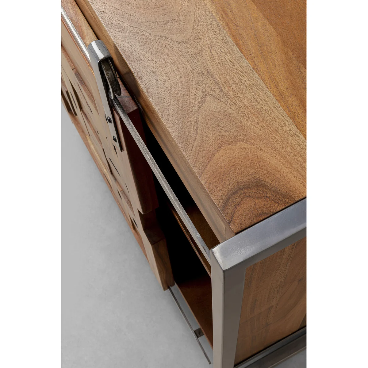 This sideboard is a practical piece of furniture that fits perfectly with different interior styles. It looks just as good in a country house as it does in a loft. With its unique design and the use of solid acacia wood, however, it is above all an attention-getter in any room. The sideboard has two sliding doors and three drawers that allow for flexible storage of bits and pieces. The frame and casters for the sliding doors made of metal, which give the furniture an industrial touch, are particularly interesting. The sideboard is handmade and each one is distinctive.