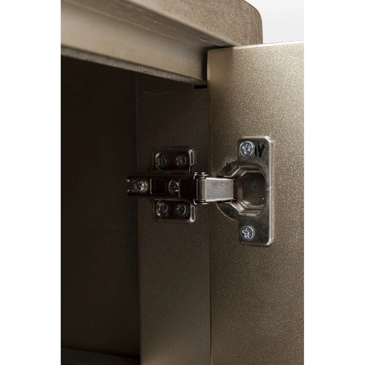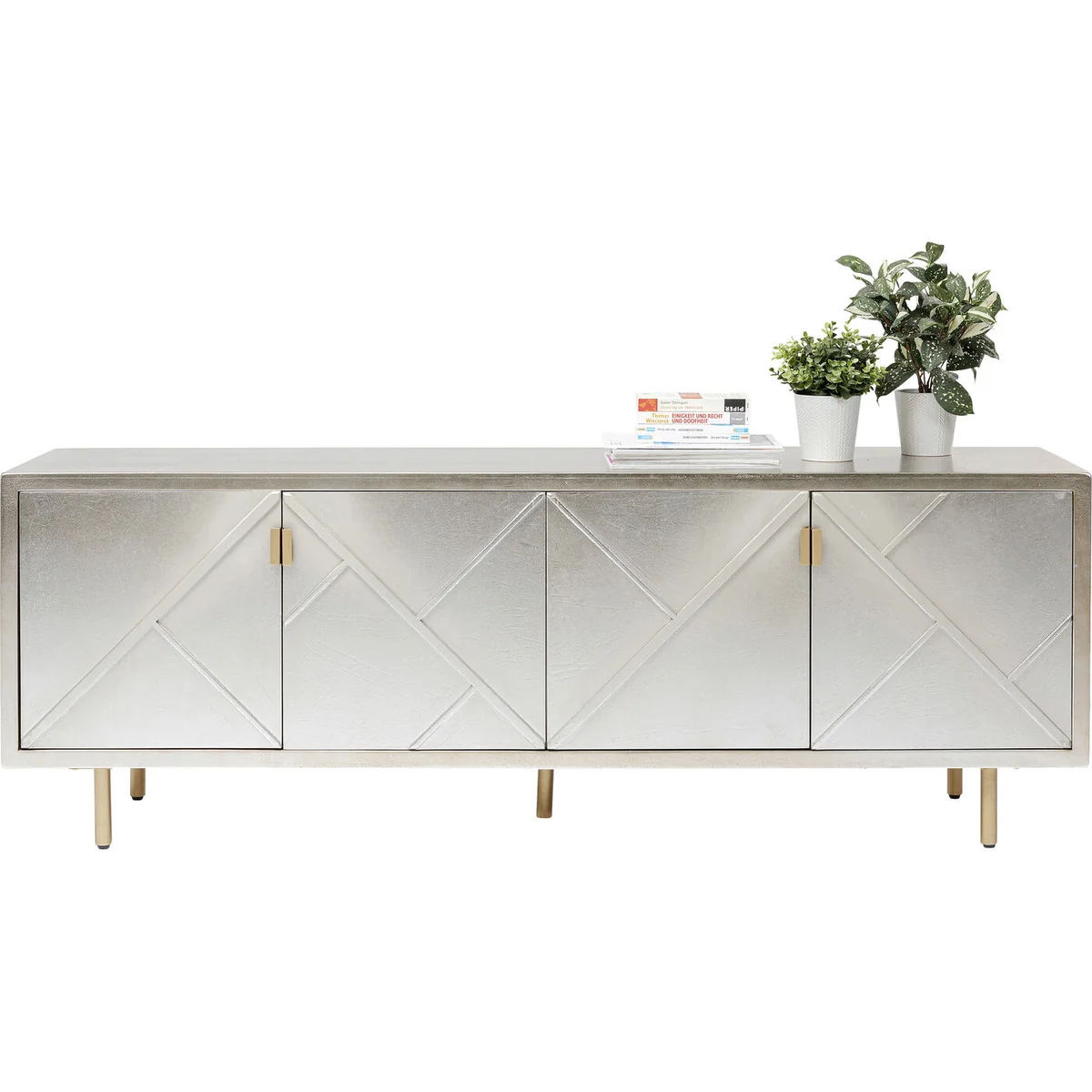 • Elegant sideboard in silver and gold with graphic front design, 64 x 180 x 45 centimetres (H/W/D) • Exclusively created for KARE by the well-known Danish furniture designer Morten Georgsen • Neat and tidy: The four spacious compartments offer plenty of storage space. Thanks to its dimensions the sideboard can also be used as the basis for a large TV screen • Scandinavian design with a portion of glamour - this is what makes the colour scheme and the exclusive front design so special • The metallic surface finish shimmers from silvery to golden, depending on the light