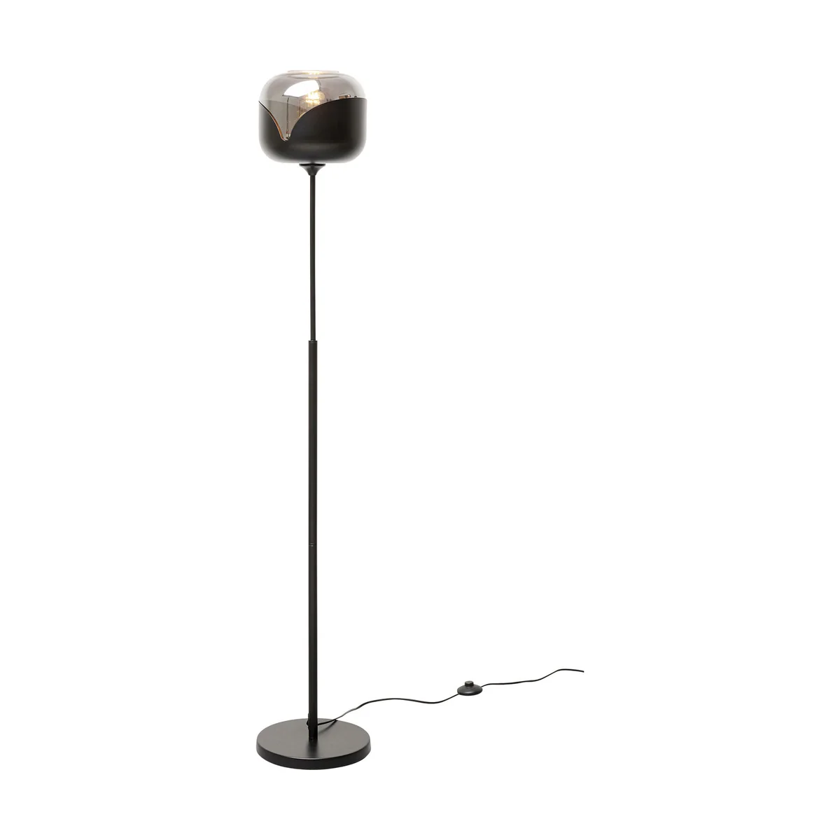 Add a touch of sophistication to your interior with our Black Smoke Goblet Ball Floor Lamp in brass-plated steel. This unique lamp combines retro glam with modern design elements to create a chic ambiance.