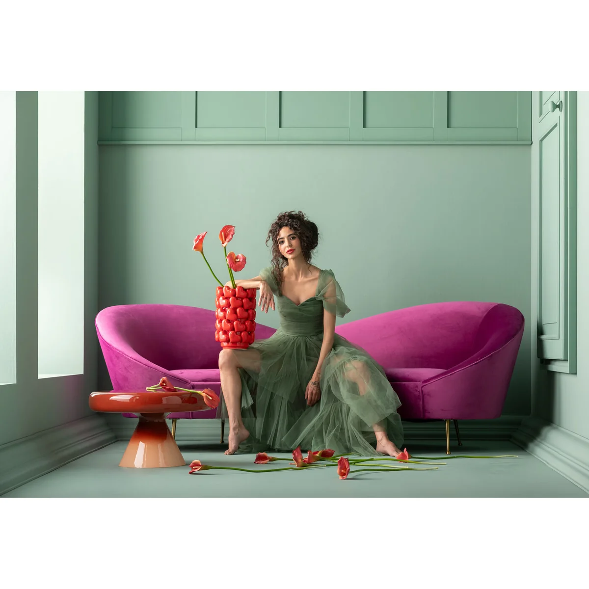 • An irresistible designer sofa for three with a fuchsia-coloured, velvet-look cover and slender legs in stainless steel with a brass finish • This three-seater couch in purple is a curvaceous star which can also be placed anywhere in the room because the back and sides are so attractive to look at • A piece of upholstered furniture with the character of a showpiece, which also offers comfortable seating • with its all-round upholstery • Side tables with marble tops and decorative objects in gold and brass match the retro flair of the sofa • Can be arranged in style with a few velvet pouffes in candy colours as a seating group