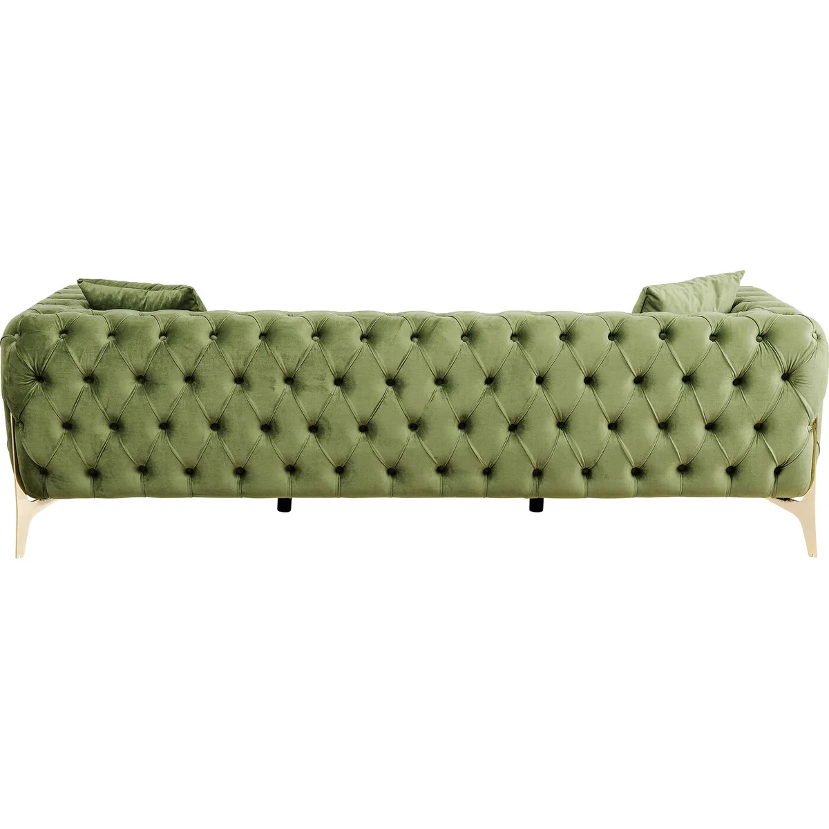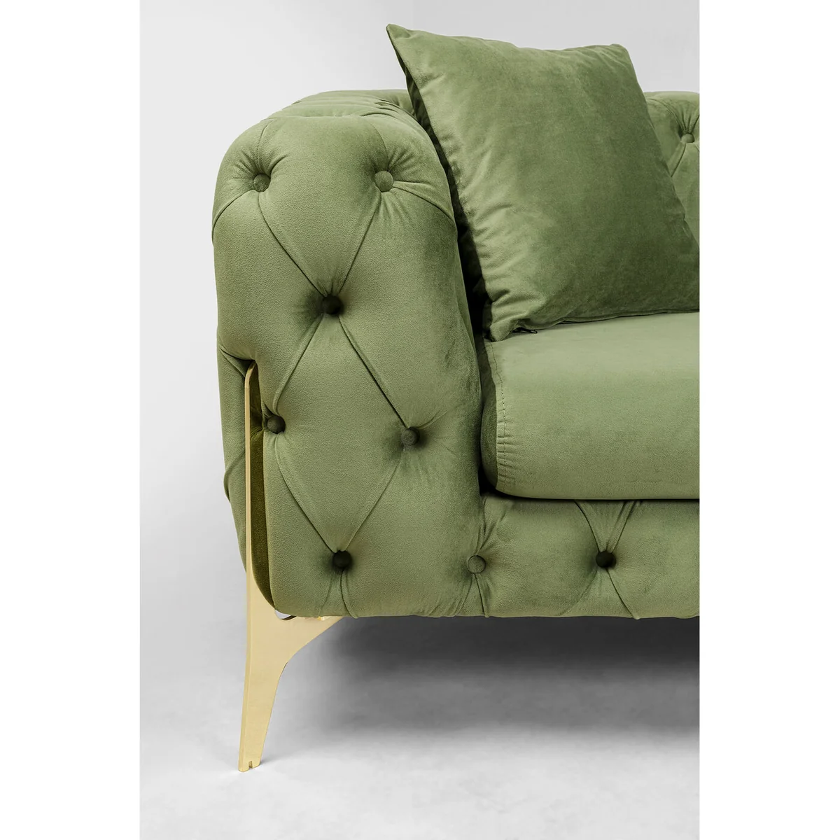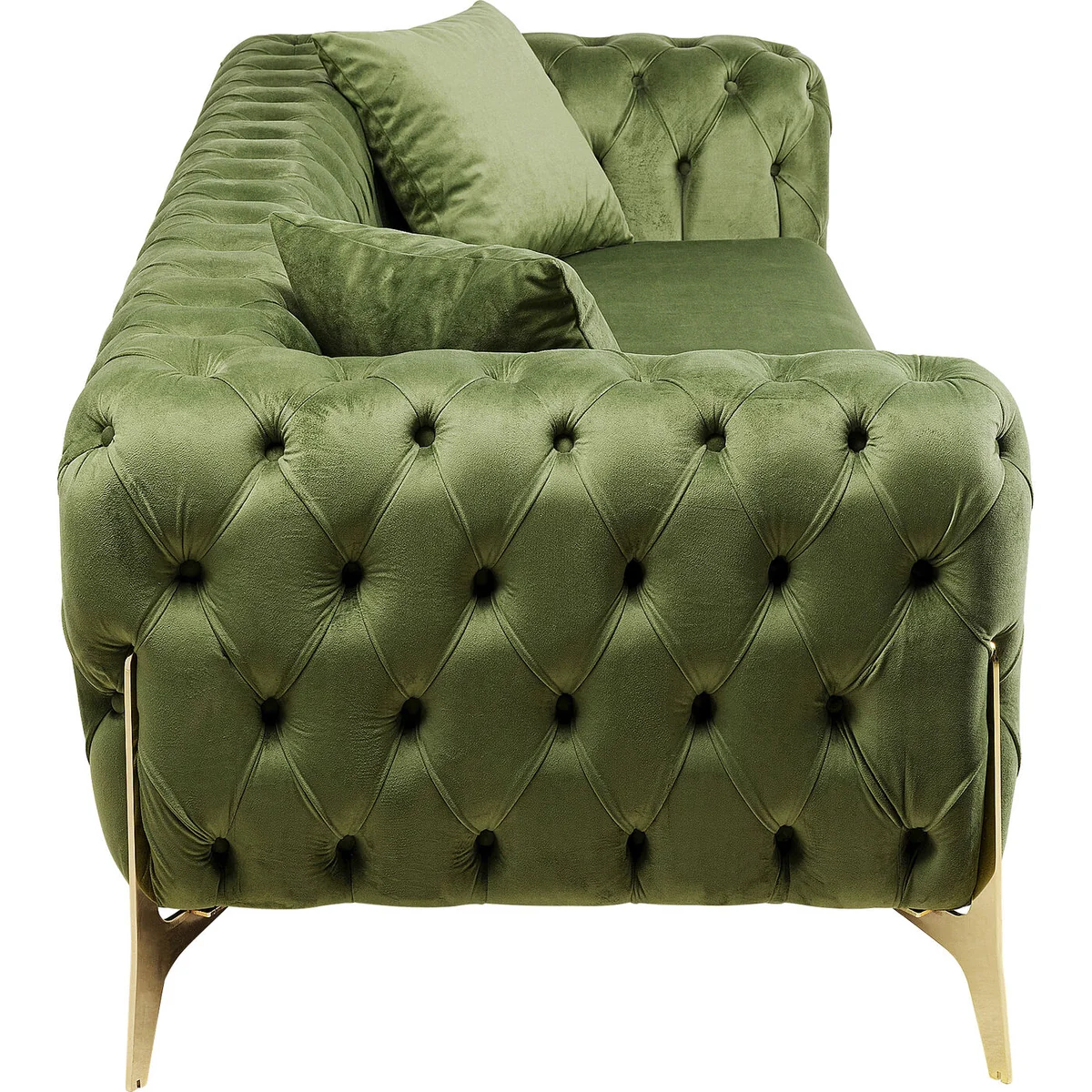 • A 3-seater sofa in green, 70x240x90cm ( H/W/D) including two decorative cushions • Classic meets modern: button stitching in the elegant Chesterfield style on modern, gold-coloured metal legs • The soft velvet-look upholstery underlines the elegant appearance of this couch • With all-over upholstery, you can easily place the velvet sofa anywhere in the room • Sturdy production with a soli