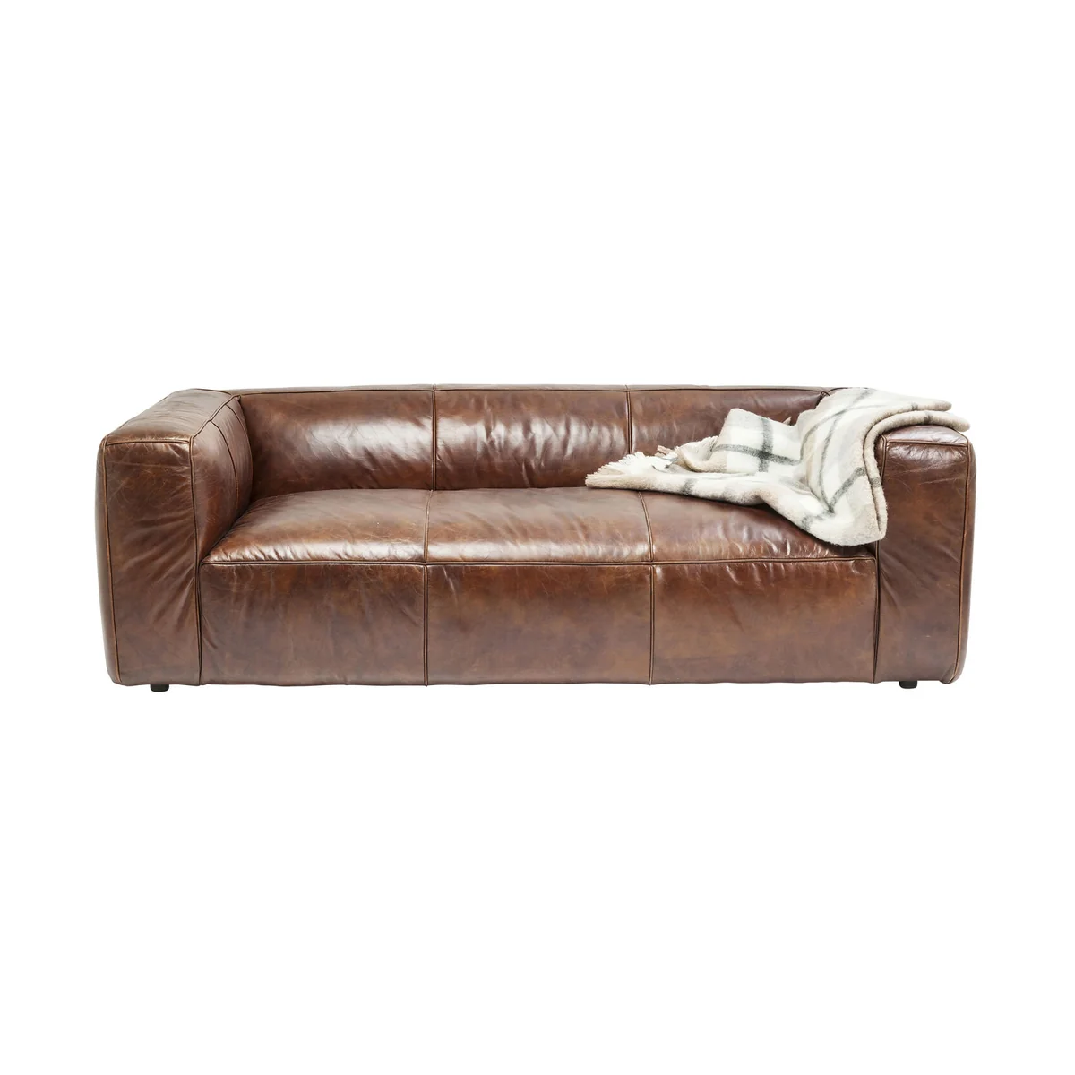 "The Cubetto 2.5-Seater Sofa in warm brown top-grain leather brings expressive character and timeless vintage appeal to your home. Its clean, cubic silhouette and beautifully aged leather finish offer an artful blend of modern structure and nostalgic charm. With deep seating and wide proportions, it creates a luxurious spot to unwind in style.