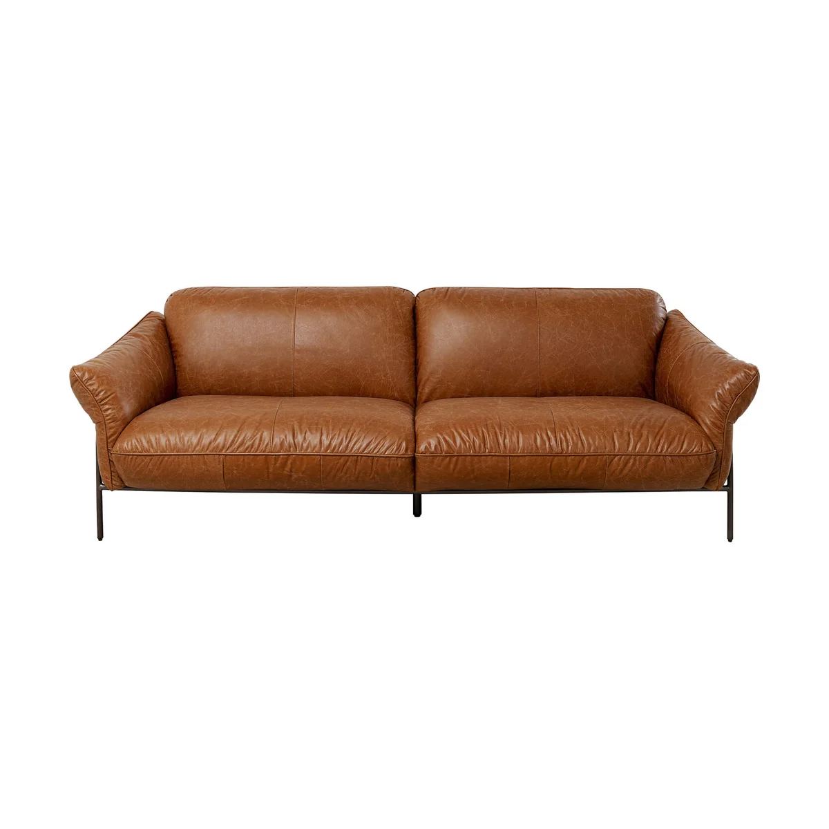 This modern leather sofa will take the interior of your living room to the next level. This high-quality brown leather sofa is a perfect complement to any living space. The two-seater couch features comfortable upholstery, no-sag springing and elastic strap suspension. The semi-aniline leather upholstery and lacquered steel legs give the sofa a timeless elegance. With a maximum load capacity of 480 kg it is also stable. Experience the comfort and durability of upholstered furniture with this leather sofa in brown.