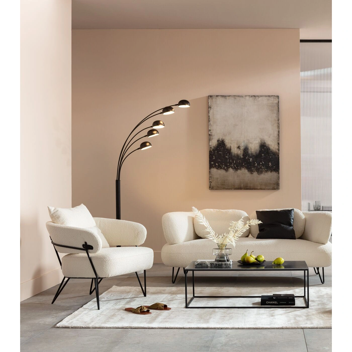 This two-seater adds tons of style: from the backrest to the cushions, everything is organically and softly shaped. The legs made of powder-coated steel in hairpin shape make the couch look light and graceful. The cover in white, which is woven in bouclé style, is also modern. With its small loops and knots it displays a vibrant surface structure and enhances the look, just like the famous designer jackets made of the same fabric. It’s not only the shape of the small sofa that’s cosy. No-sag springing and foam padding ensure pleasant seating comfort with a seat height of 43cm.
