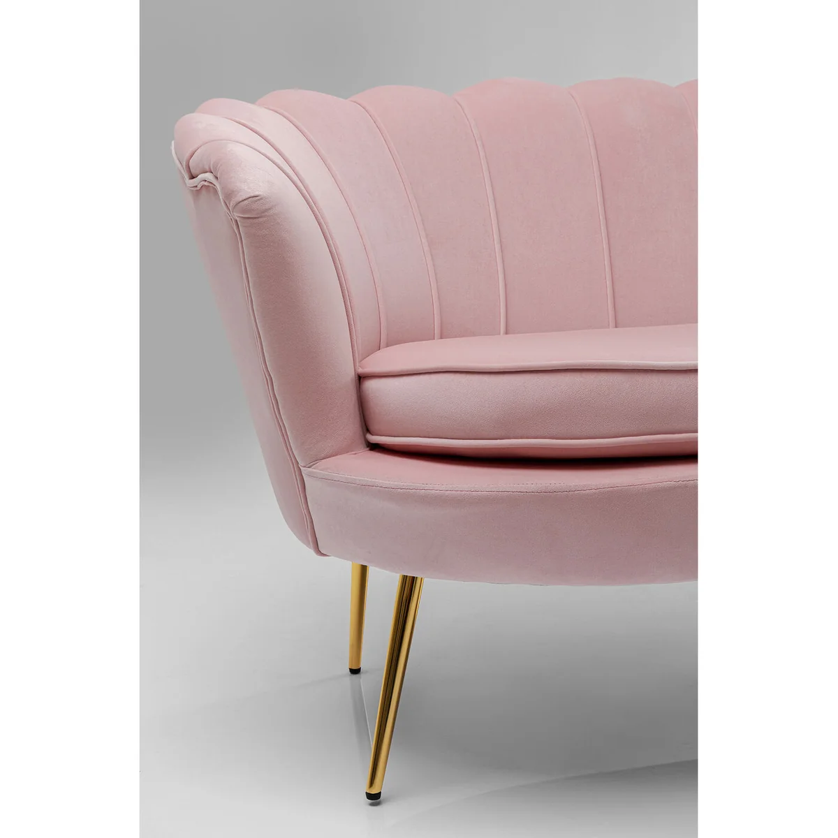 Upholstered in a pastel rose velvet fabric, the sofa shimmers subtly atop brass-coloured legs, adding a warm, luxurious touch. The continuous rounded arm and backrest create a smooth, enveloping shape for added comfort. Thoughtfully crafted details, including oval padded seating and decorative piping seams, enhance its refined look. Built with a durable natural plywood frame, it offers reliable support despite its compact size.