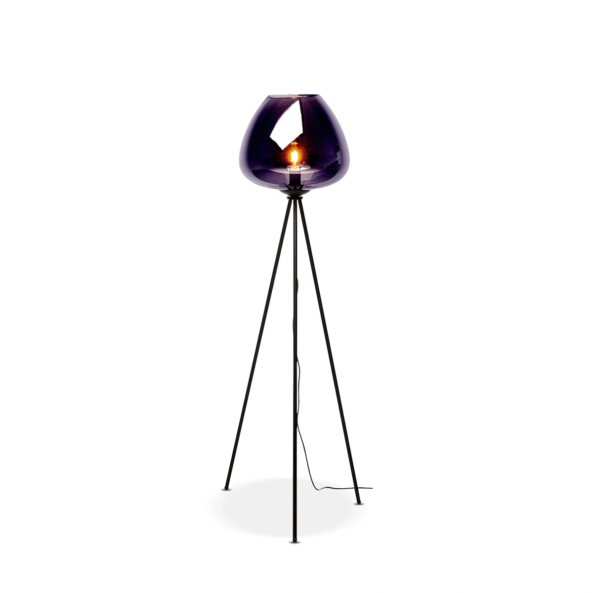 Introducing the Sphere Blue Glass Floor Lamp with a Brass-Finish Steel Frame. This stunning floor lamp seamlessly blends cool silver with a deep blue hue, making it an opulent addition to any living space.