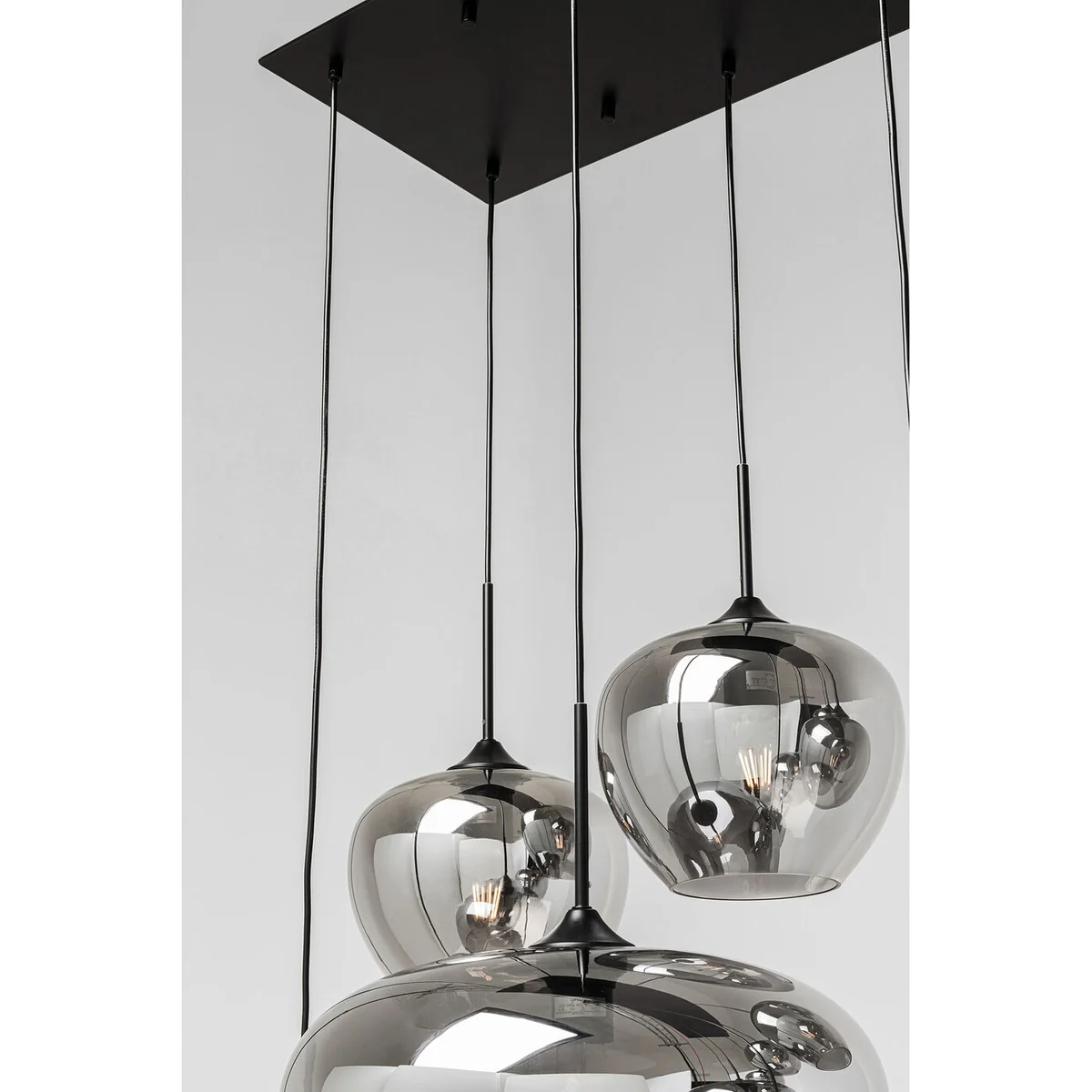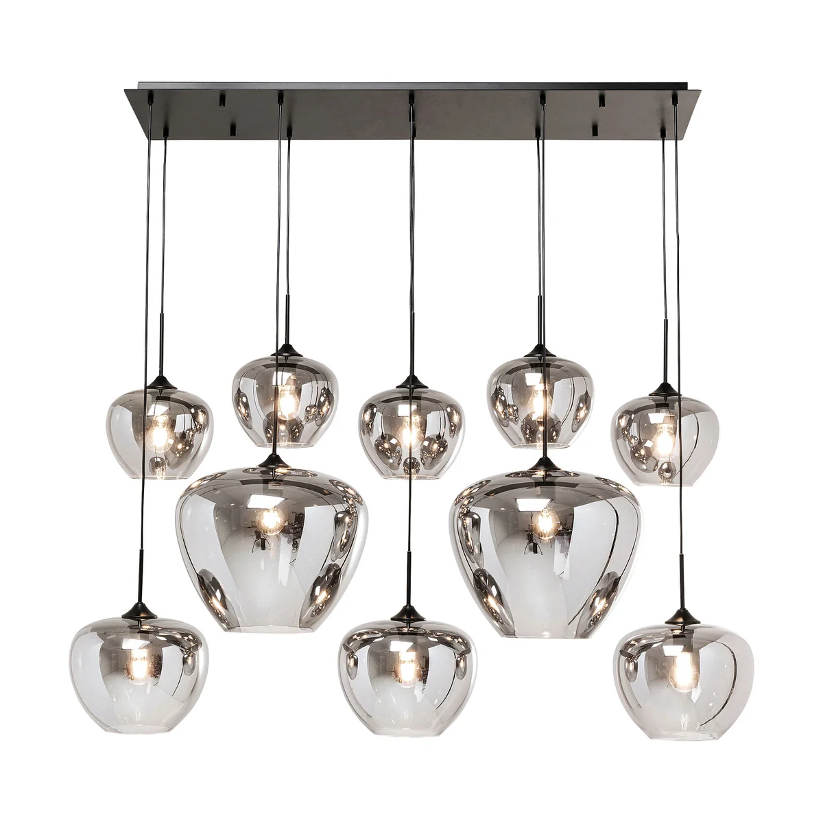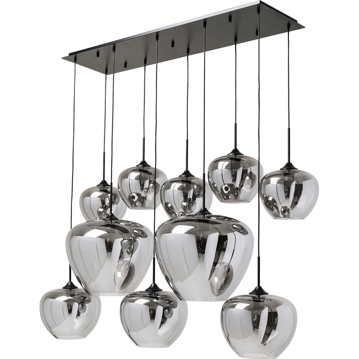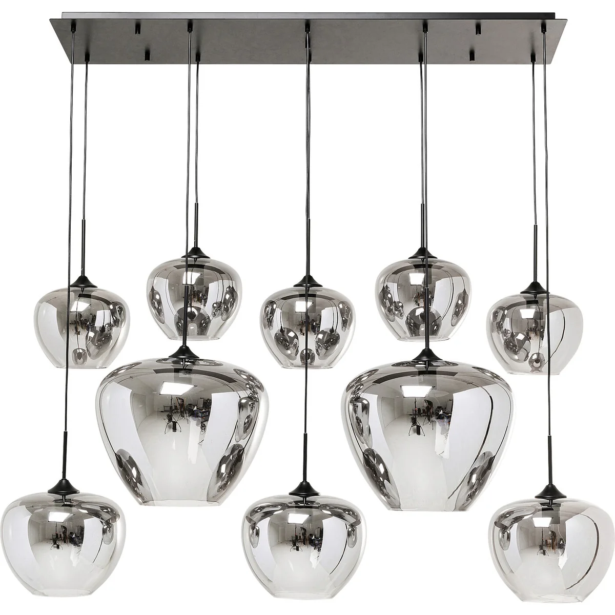 Boasting ten exclusive lampshades made of galvanized glass, this 160 x 45 x 45 centimeters pendant light offers harmonious design and pleasant lighting. Height-adjustable for versatility, it can be effortlessly incorporated into various room concepts and furnishing styles. The black lamp holders and the ceiling canopy are made of chrome-plated steel, highlighting the luxurious character of the lamp.
