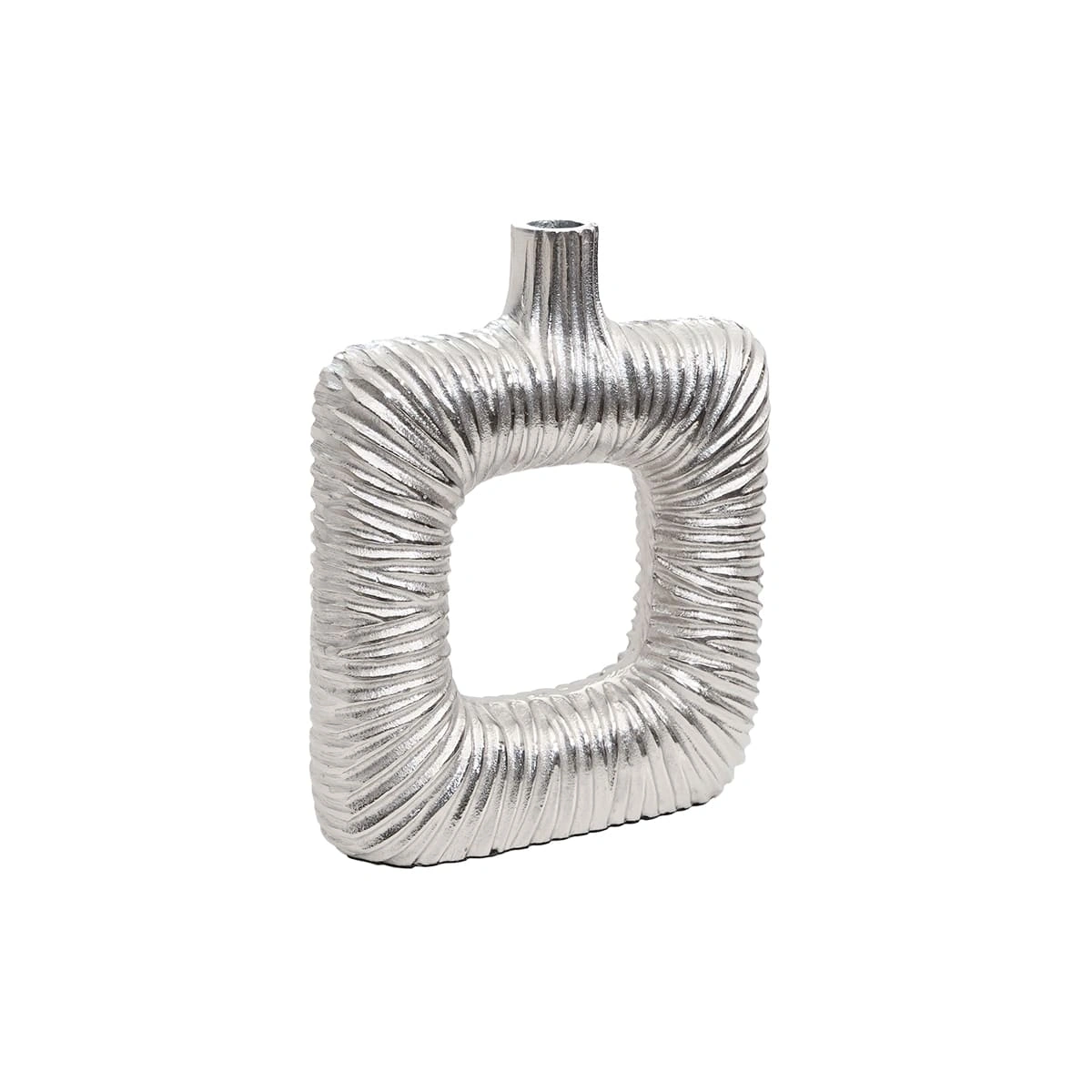 Welcome home the Small Square Hole Ridged Vase in Raw Silver. A perfect blend of modern geometry and artistic flair, it is designed to elevate your home decor.